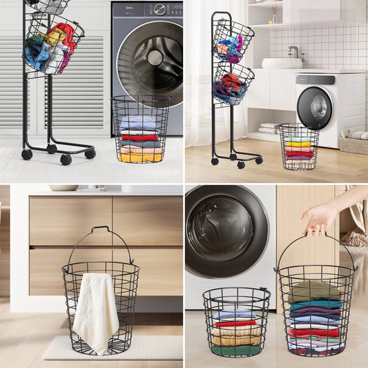 Removable 3 Tier Metal Rolling Laundry Basket Cart,Large Capacity Wire Basket Laundry Hamper with Wheels, Laundry Butler for Bathroom Bedroom Laundry Room, Black