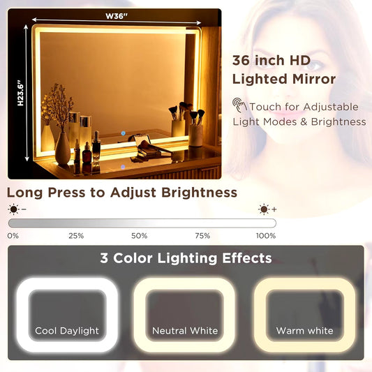 48" Modern Fluted Makeup Vanity Desk with Large 36" Mirror & Lights,