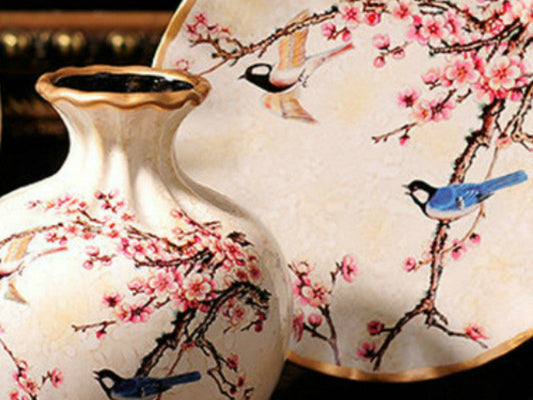 Cherry Blossom Meadow 3-Piece Ceramic Vase Set – Elegant Off-White Decorative Vases with Golden Rim