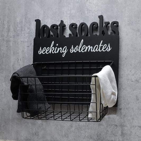 Cutout Letters Lost Socks - Laundry Room Organization, Farmhouse Laundry Room Decor and Accessories - House Decor Rustic Wooden Laundry Sign Wall Decor with Attached Basket - Black