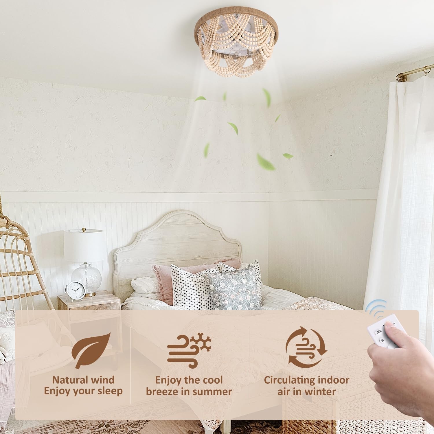 Transform your living space with our Elegant 20" Boho Ceiling Fan, designed to combine functionality with stunning aesthetics. This beautiful ceiling fan features upgraded wooden bead strands that enhance durability and reliability, making it a long-lasting addition to your home.