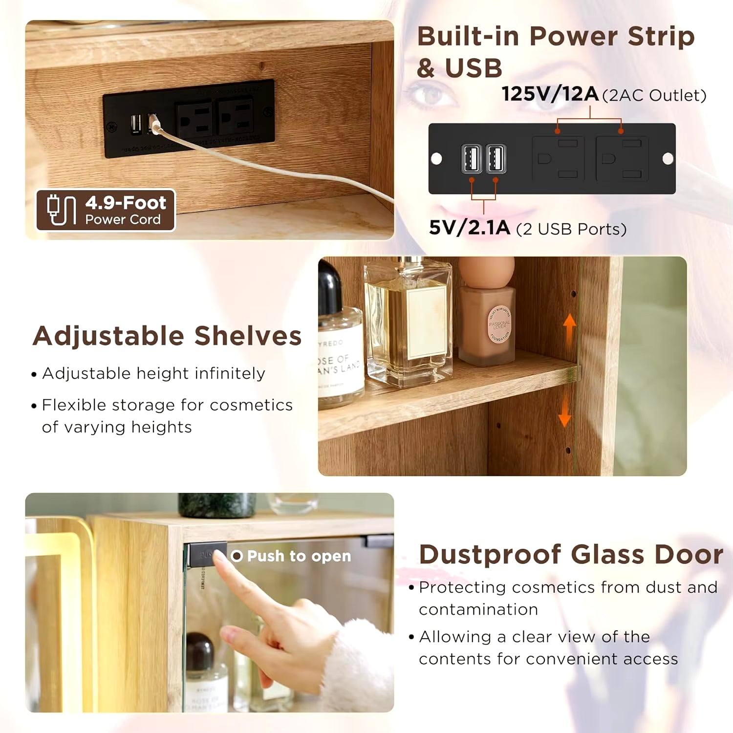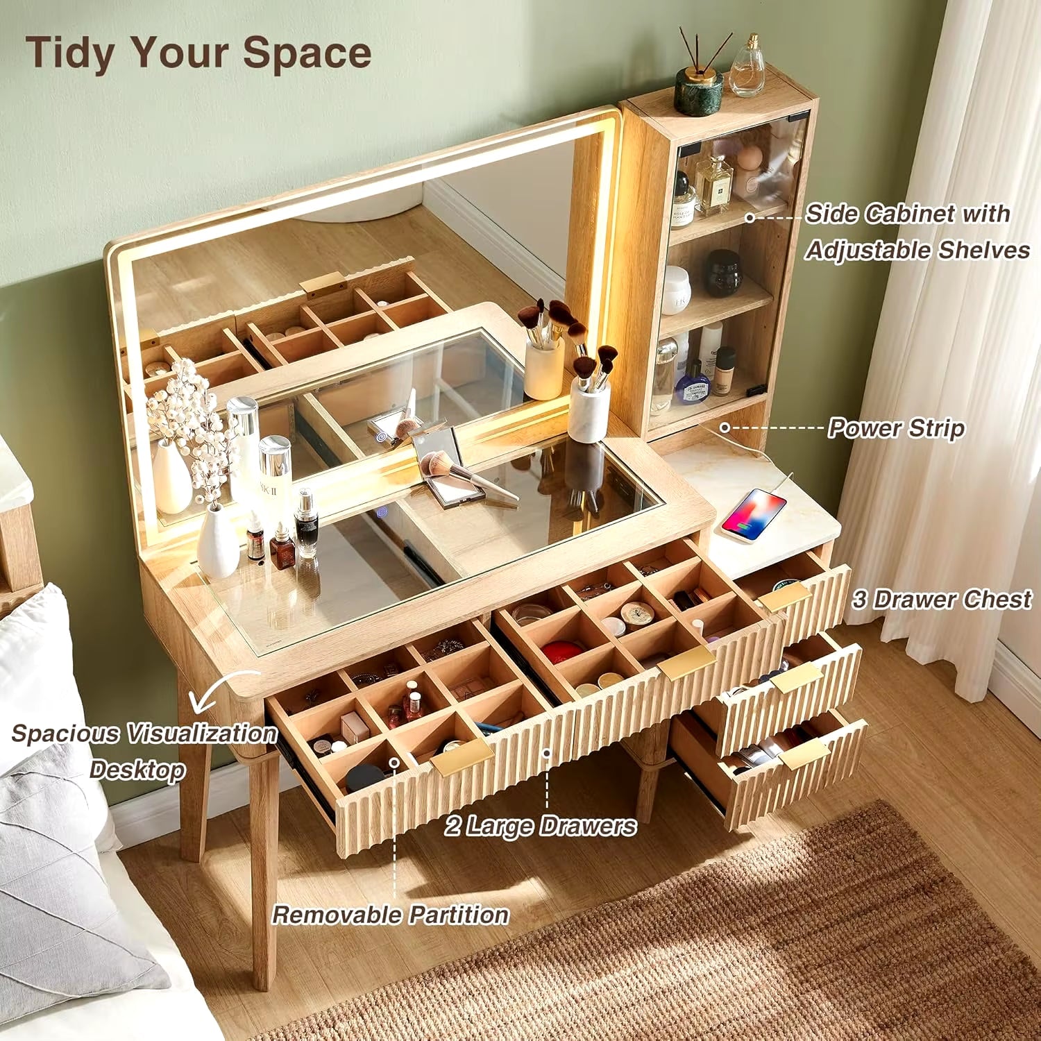 - Built-in Charging Station: Conveniently charge your devices or use beauty tools without cluttering your tabletop space.