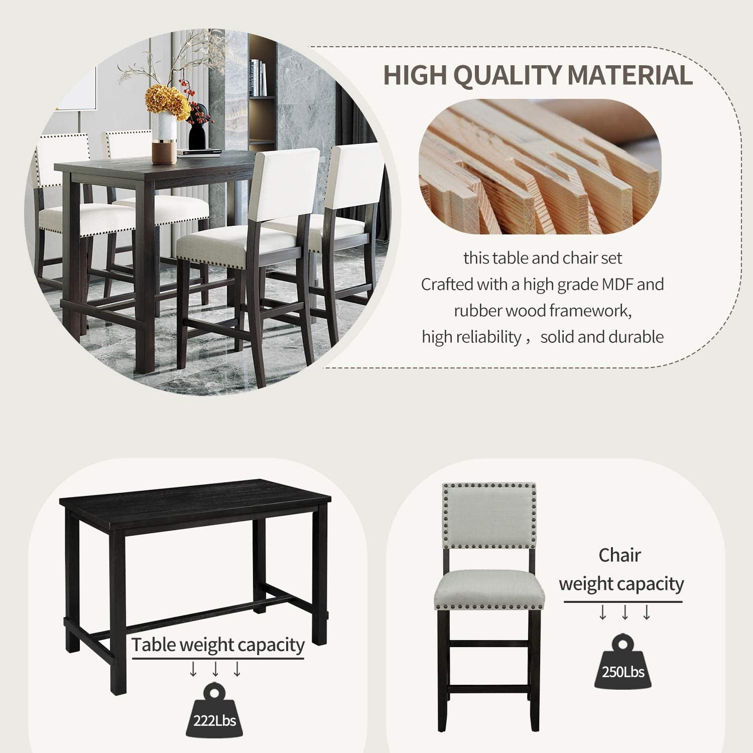 - 【Wooden Dinne Table Set】wooden table set is made from a high quality MDF and rubber wood framework, this table and chair set are of high reliability to become a staple in your home with solid and durable nature. Table weight capacity: 222lbs; Chair weight capacity: 250lbs.