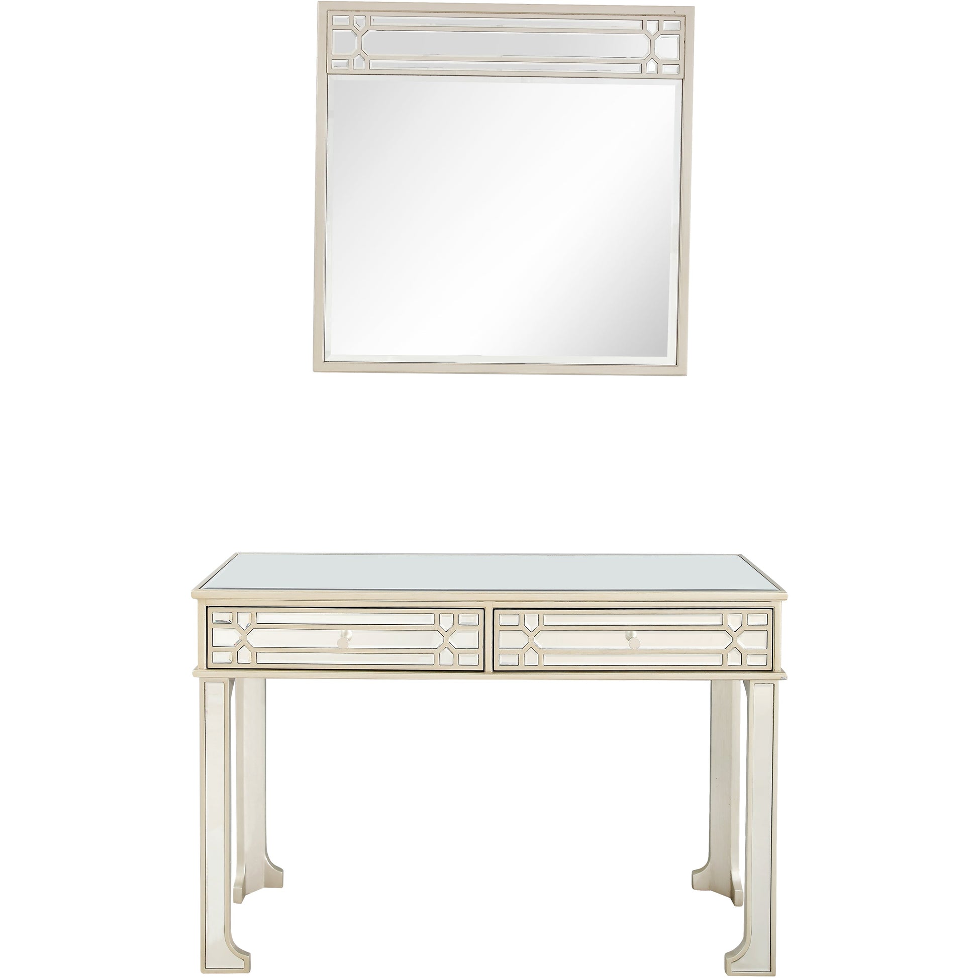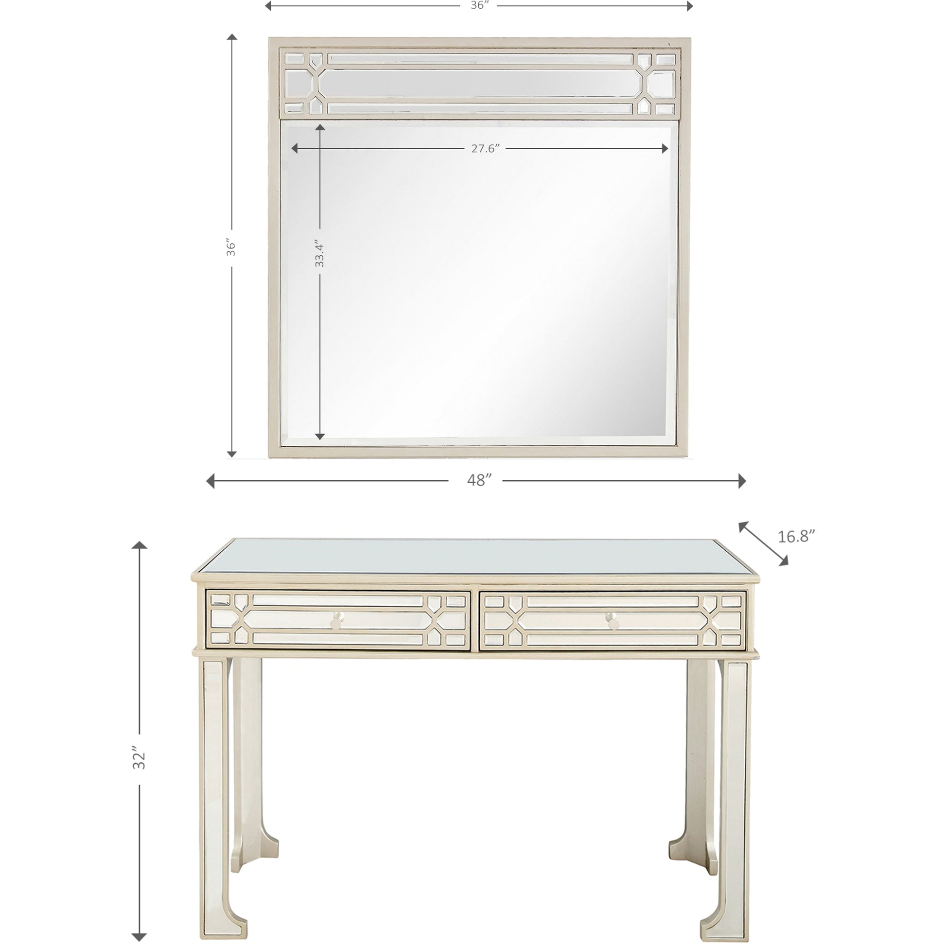 Add a regal feel anywhere in your home with the stylish Aubrey Mirror Console. With its beautifully crafted drawers from beveled mirror pieces, this console exudes elegance and charm. Its champagne color and uniquely designed legs add a new dimension to your living room or entryway. Add a luxurious touch to your living space with Aubrey Beveled Accent Mirror. It features an intricate design on the top border that adds a touch of elegance to your decor. Its square shape makes it ideal for smaller walls, but it looks equally good in any space with its antiqued champagne frame. This lovely mirror blends beautifully into any color palette. Beveled 36 x 36 mirror has a high quality silver backing. Ready to hang either vertically or horizontally with pre-attached hanging mounts.