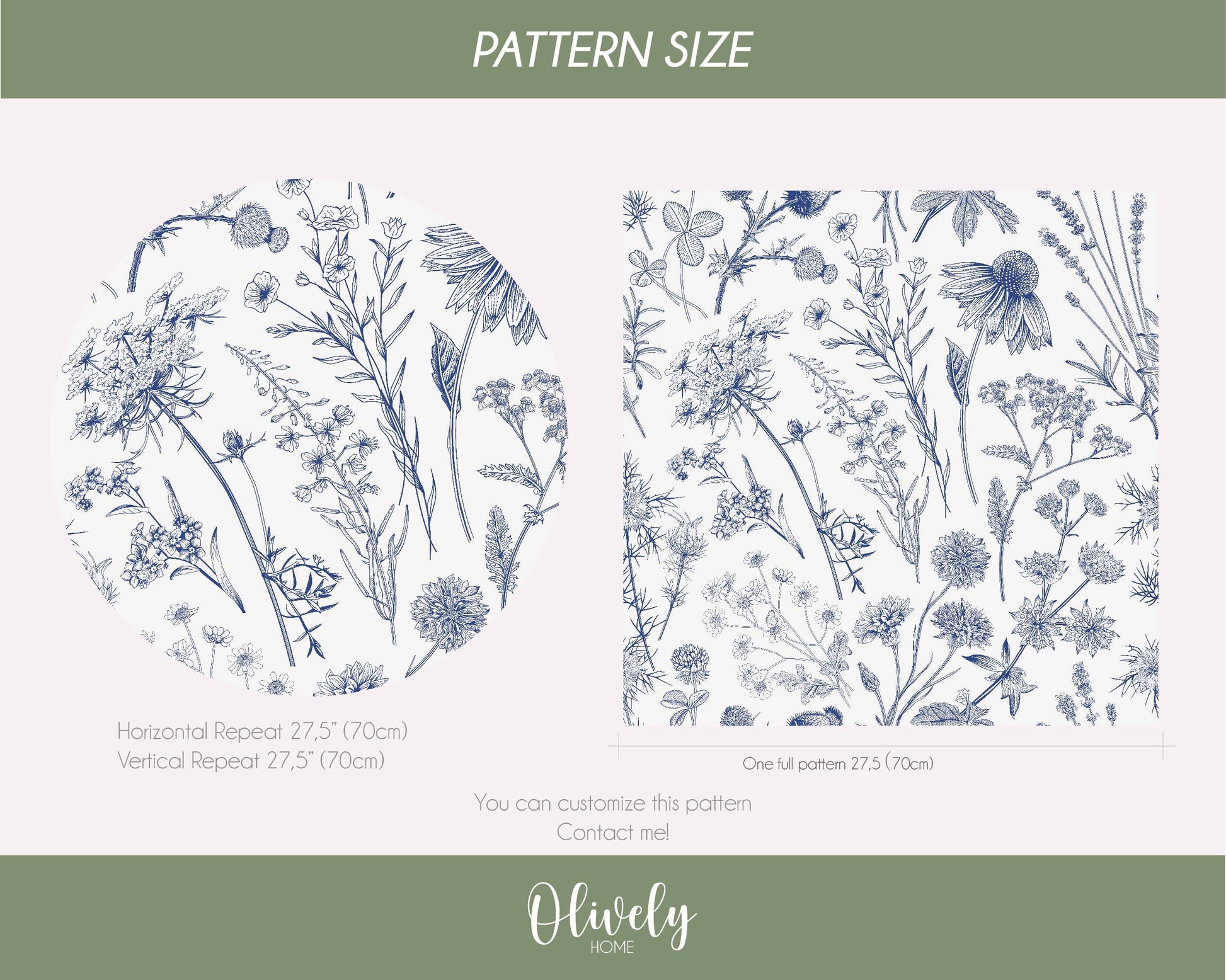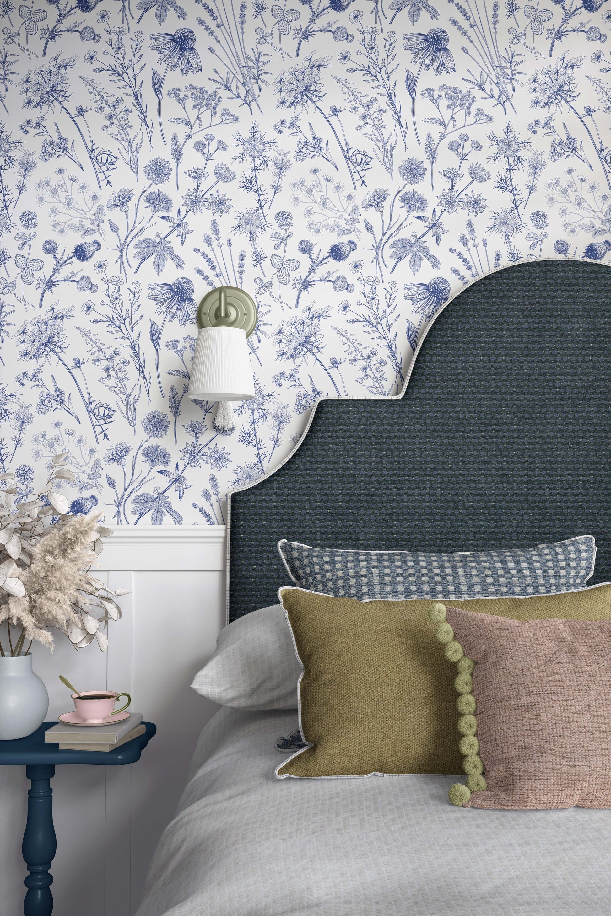 Our Blue Toile flowers wallpaper features charming blue wildflowers on a crisp white background. Ideal for creating a soft, feminine ambiance, this design is perfect for a bedroom, powder room, or nursery. The gentle floral pattern brings a touch of nature indoors, evoking a serene and elegant atmosphere that's both timeless and refreshing.