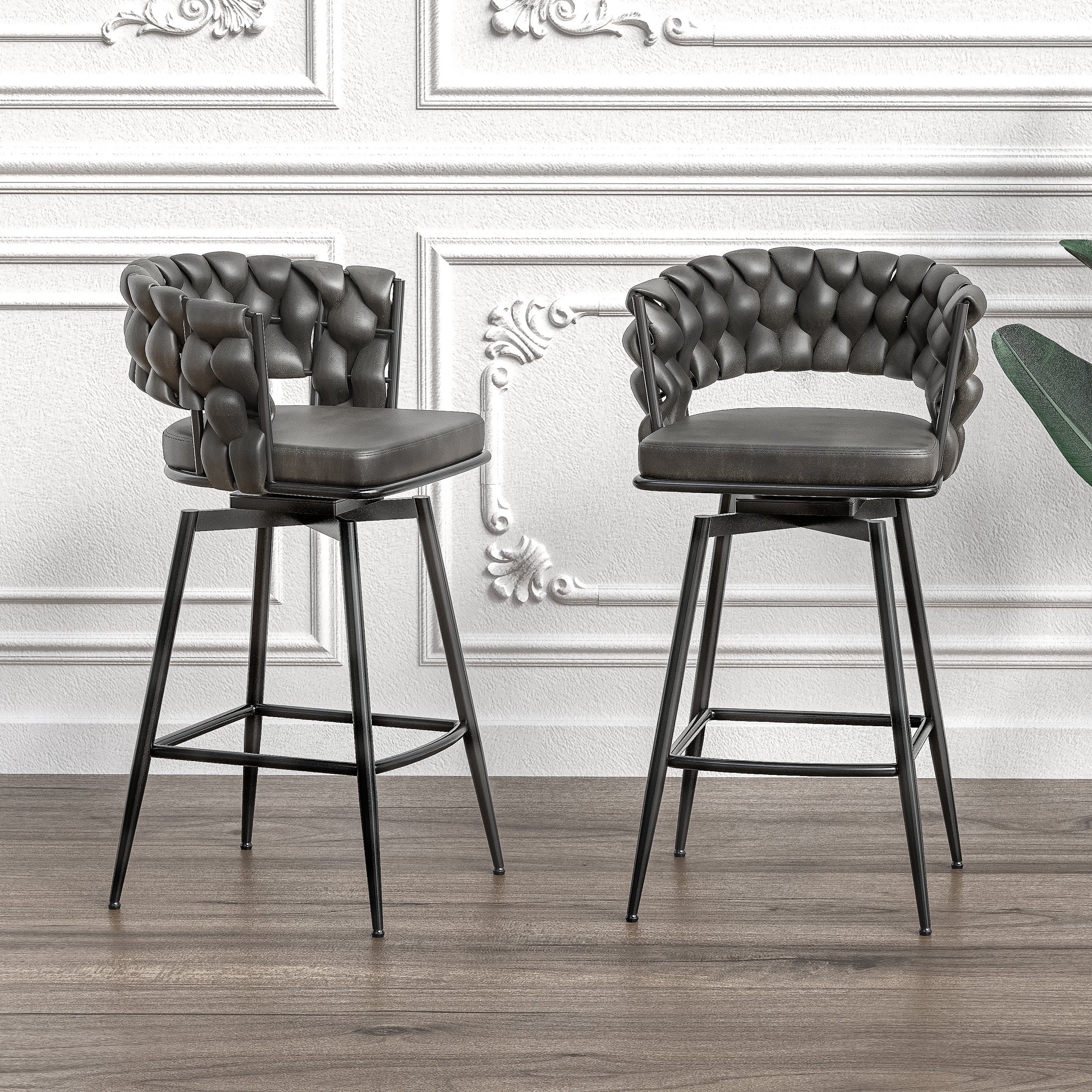 28' Technical Leather Woven Bar Stool Set of 2,Black legs Barstools No Adjustable Kitchen Island Chairs,360 Swivel Bar Stools Upholstered Counter Stool Arm Chairs with Back Footrest (Tan)