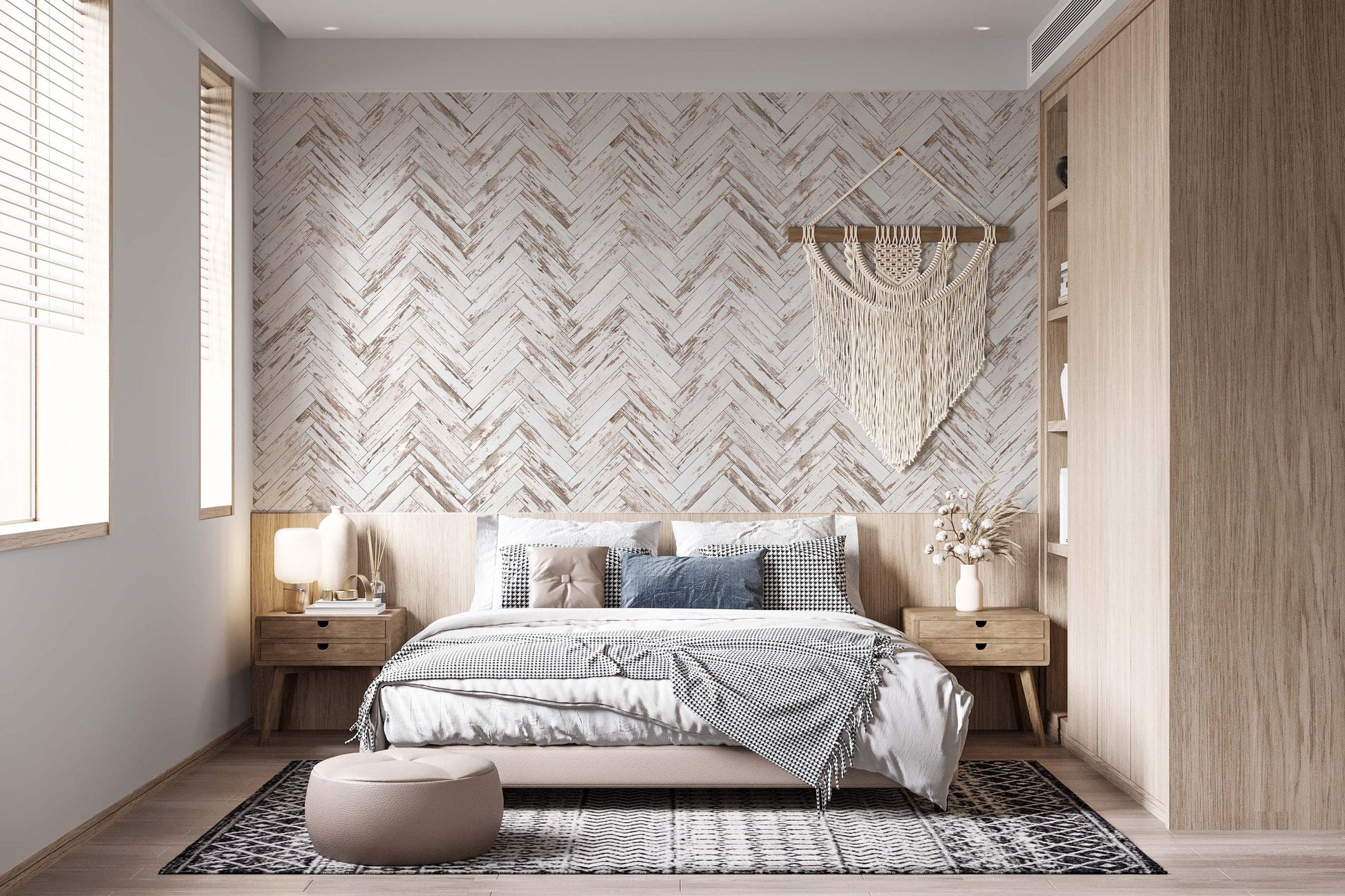This wallpaper captures the warmth and texture of real wood planks while adding a contemporary twist with the classic Chevron pattern. It's perfect for those seeking to infuse their interiors with a touch of classic and distressed timber aesthetics.