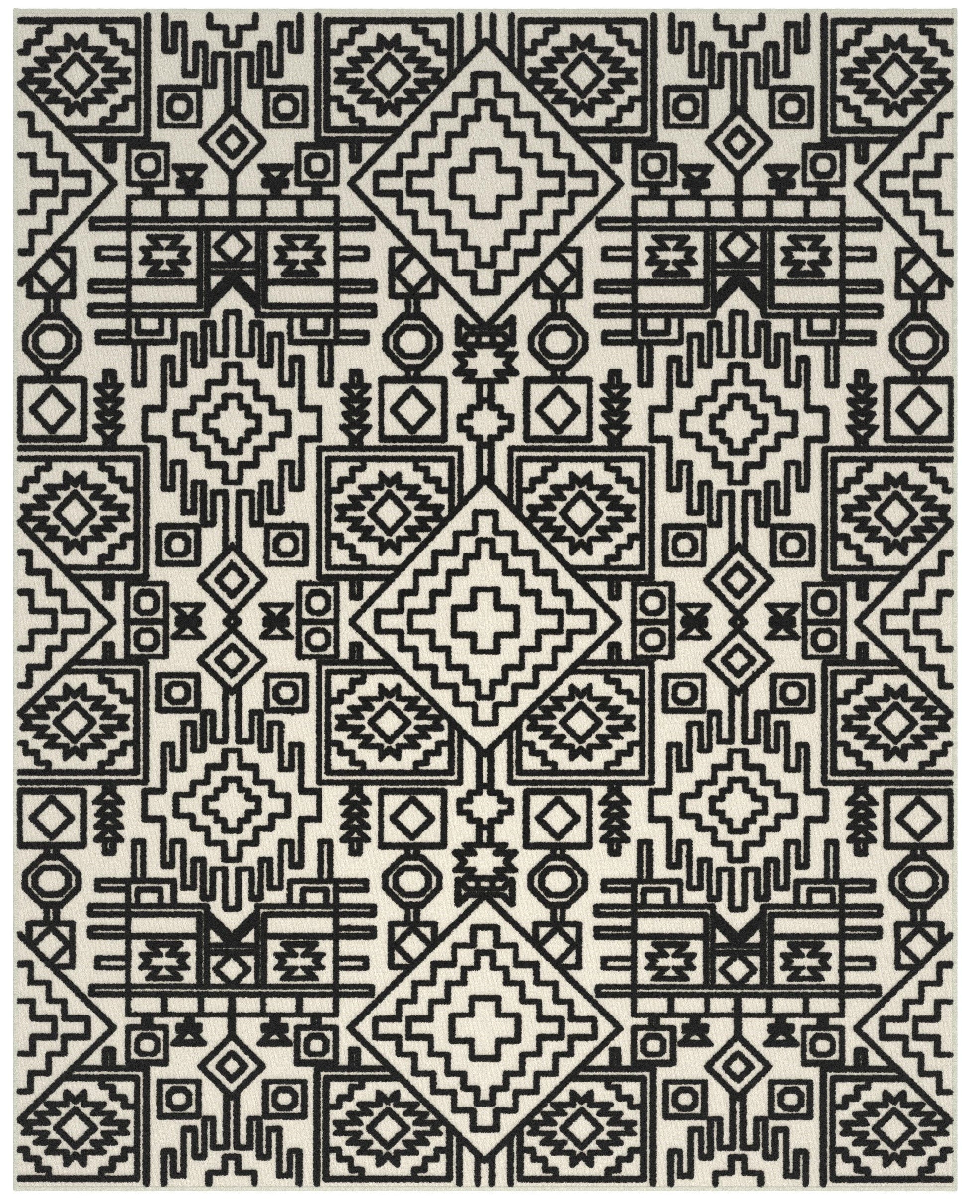 - Features a neutral ivory base with black raised geometric, tribal designs