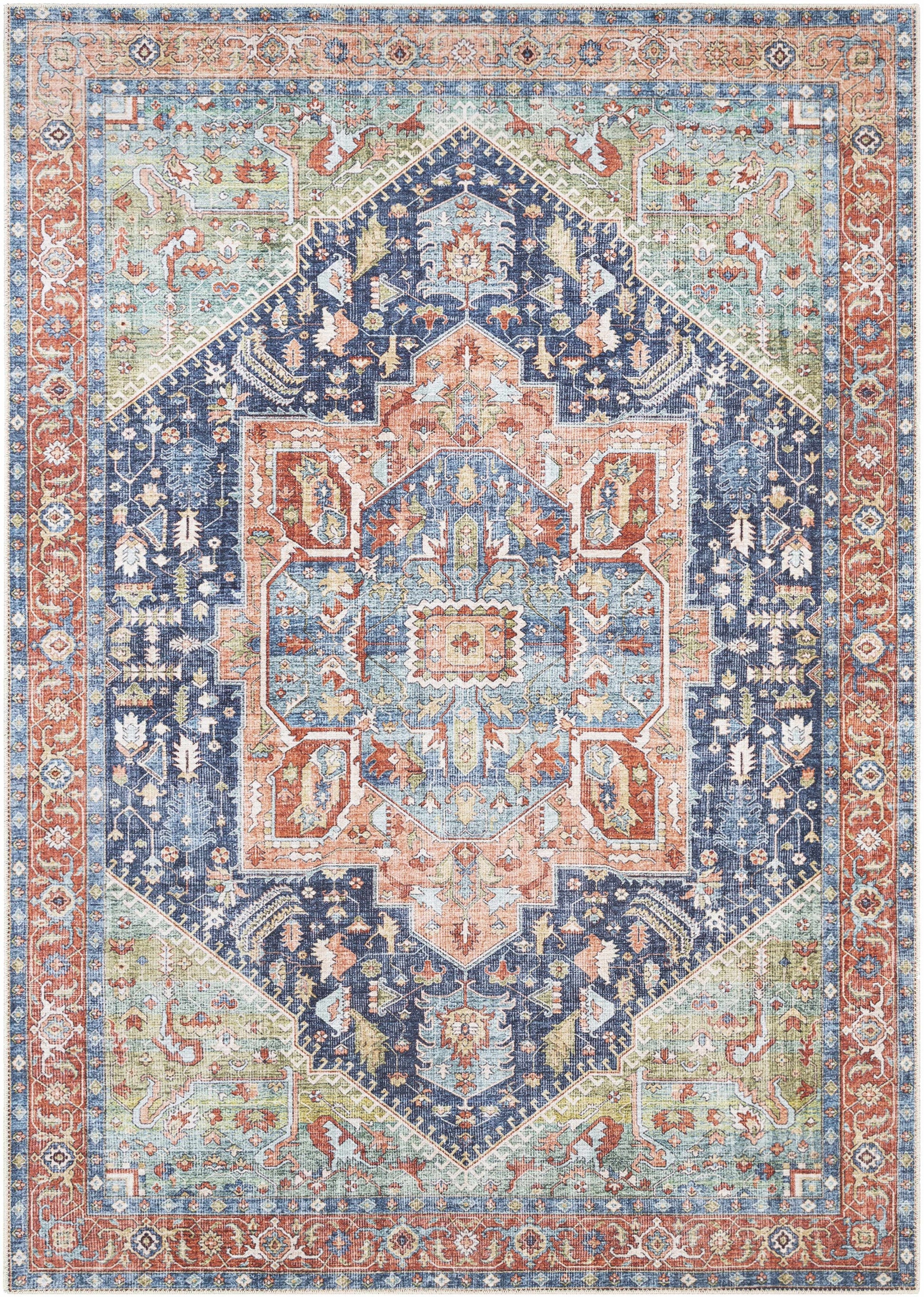 About: The Exira Washable Area Rug features a timeless traditional medallion design in vibrant multi-color tones. This rug effortlessly brings a fresh, unique atmosphere to any room, adding both style and comfort. Perfect for enhancing the decor of various spaces, it's durable, easy to clean, and versatile.
