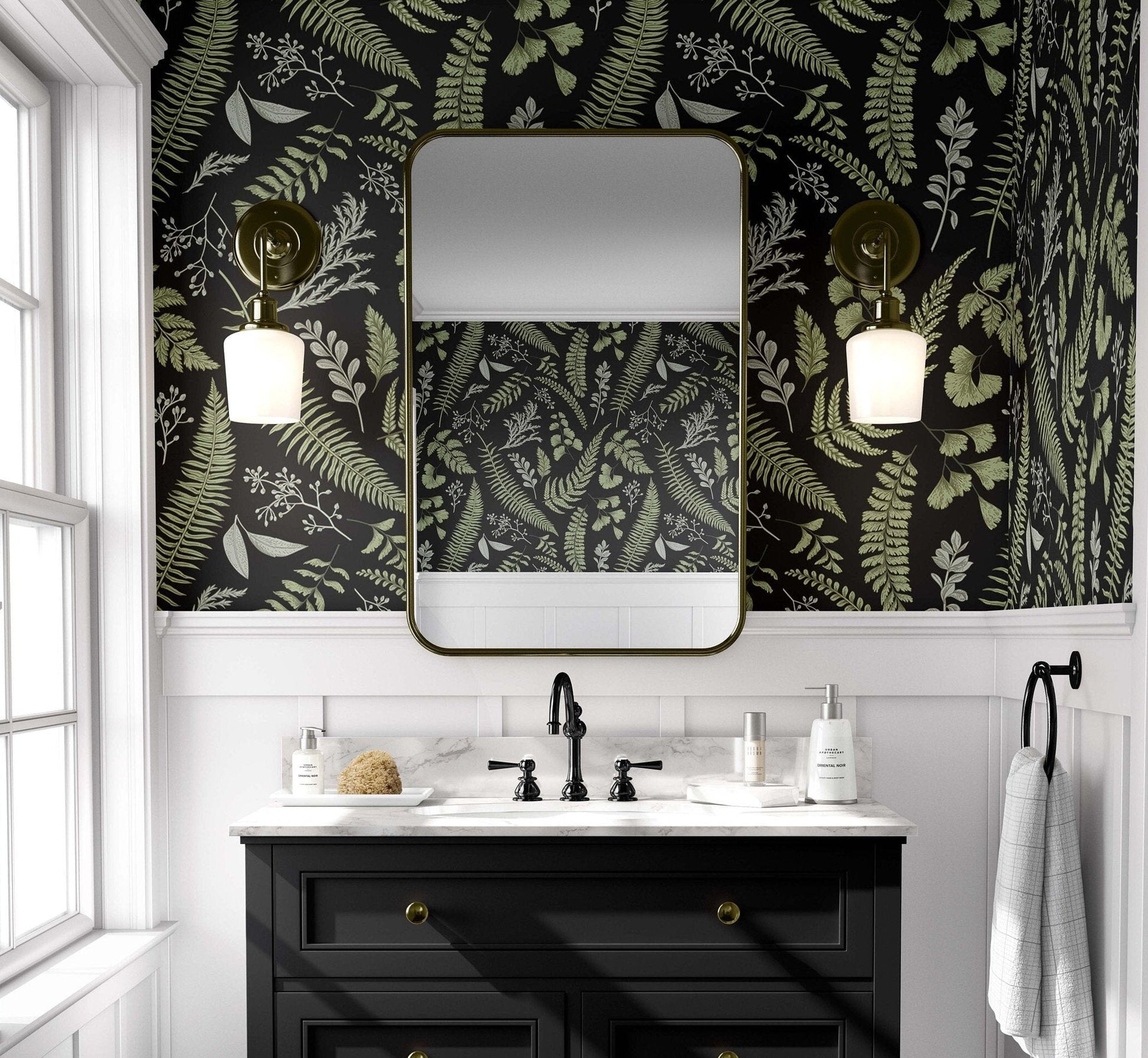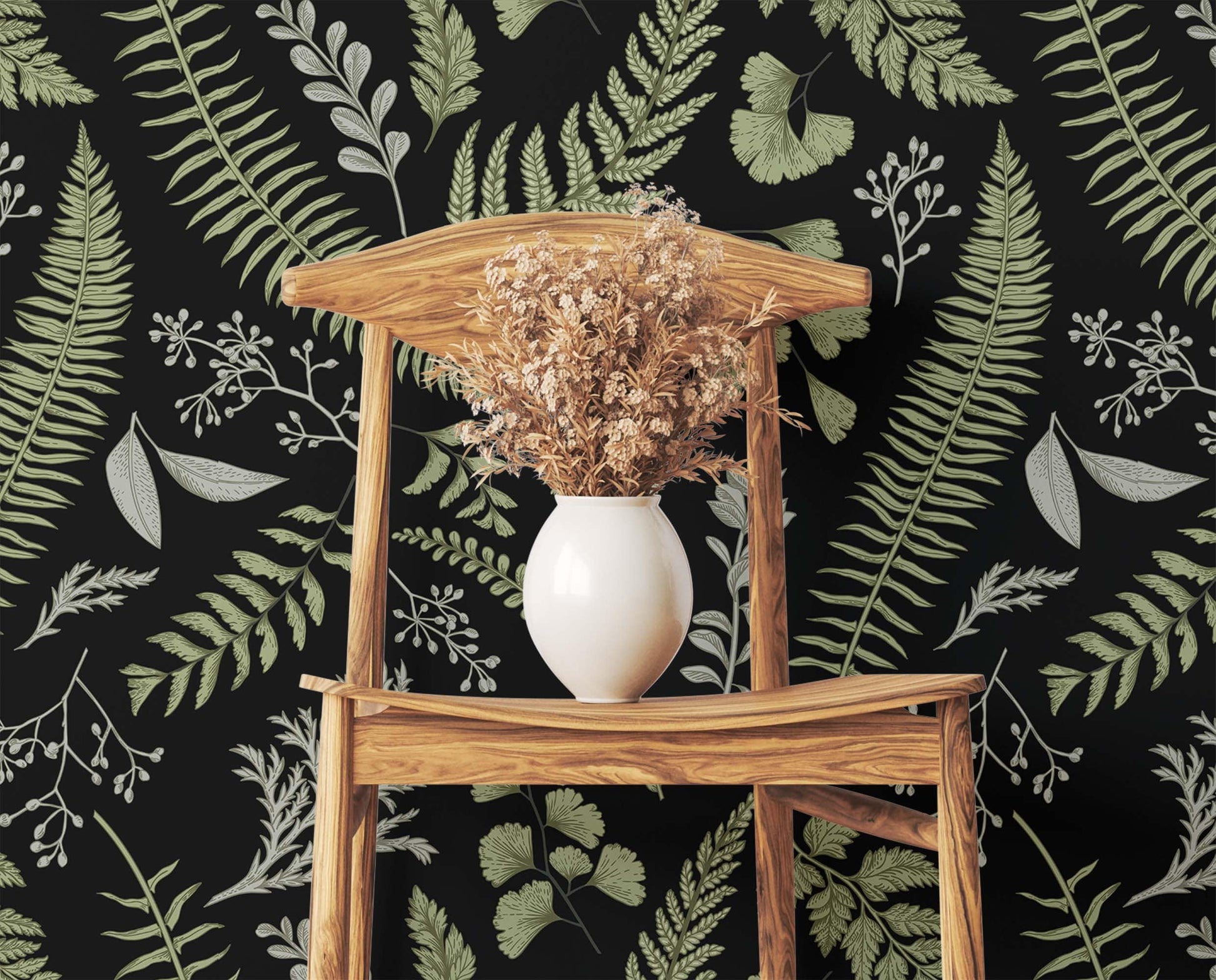 Transform your space with the Calming Fern Forest wallpaper, a unique creation. This custom wallpaper is designed to bring a touch of nature into your interior, featuring the beauty of ferns and leaves in a black background.