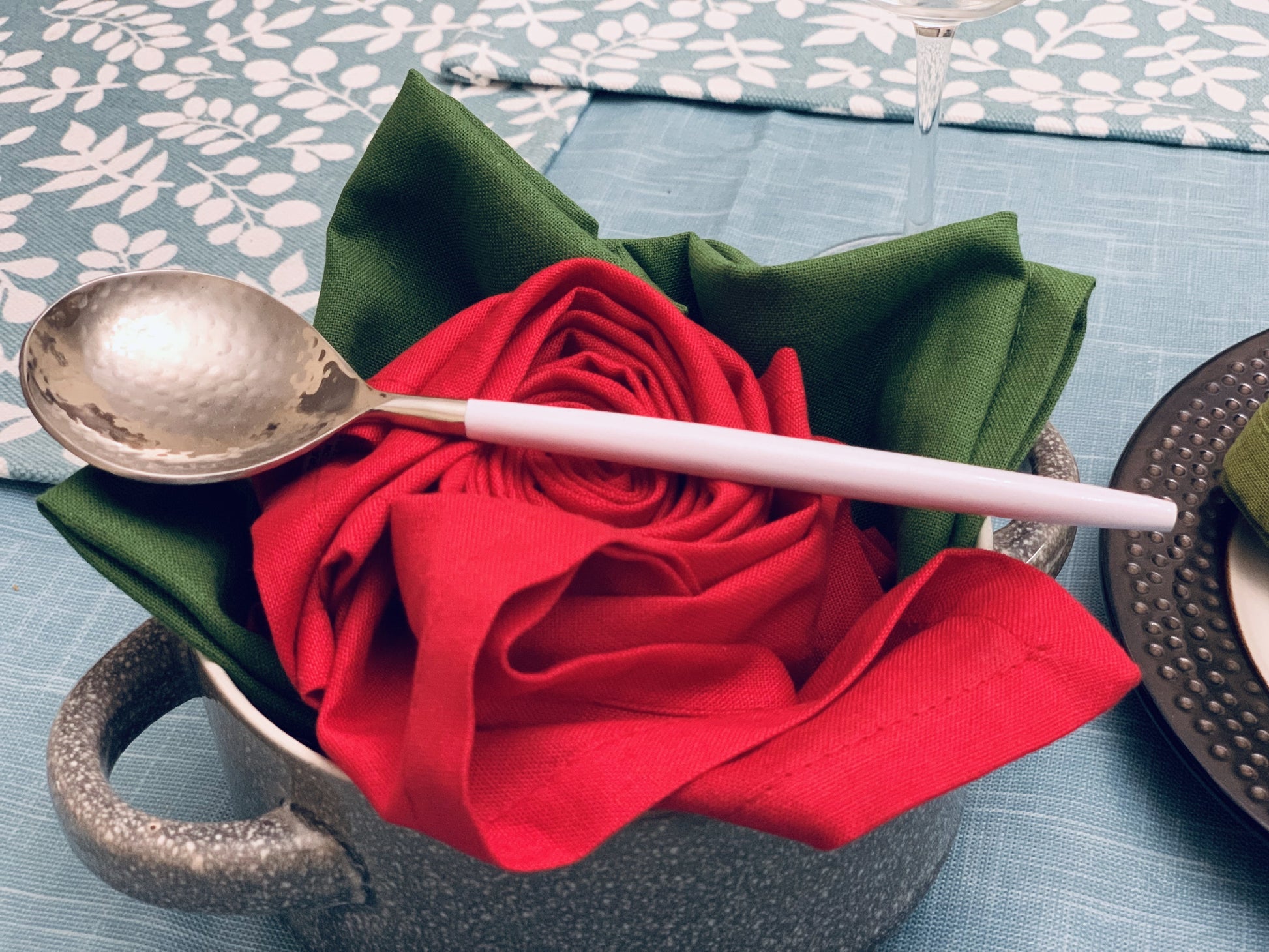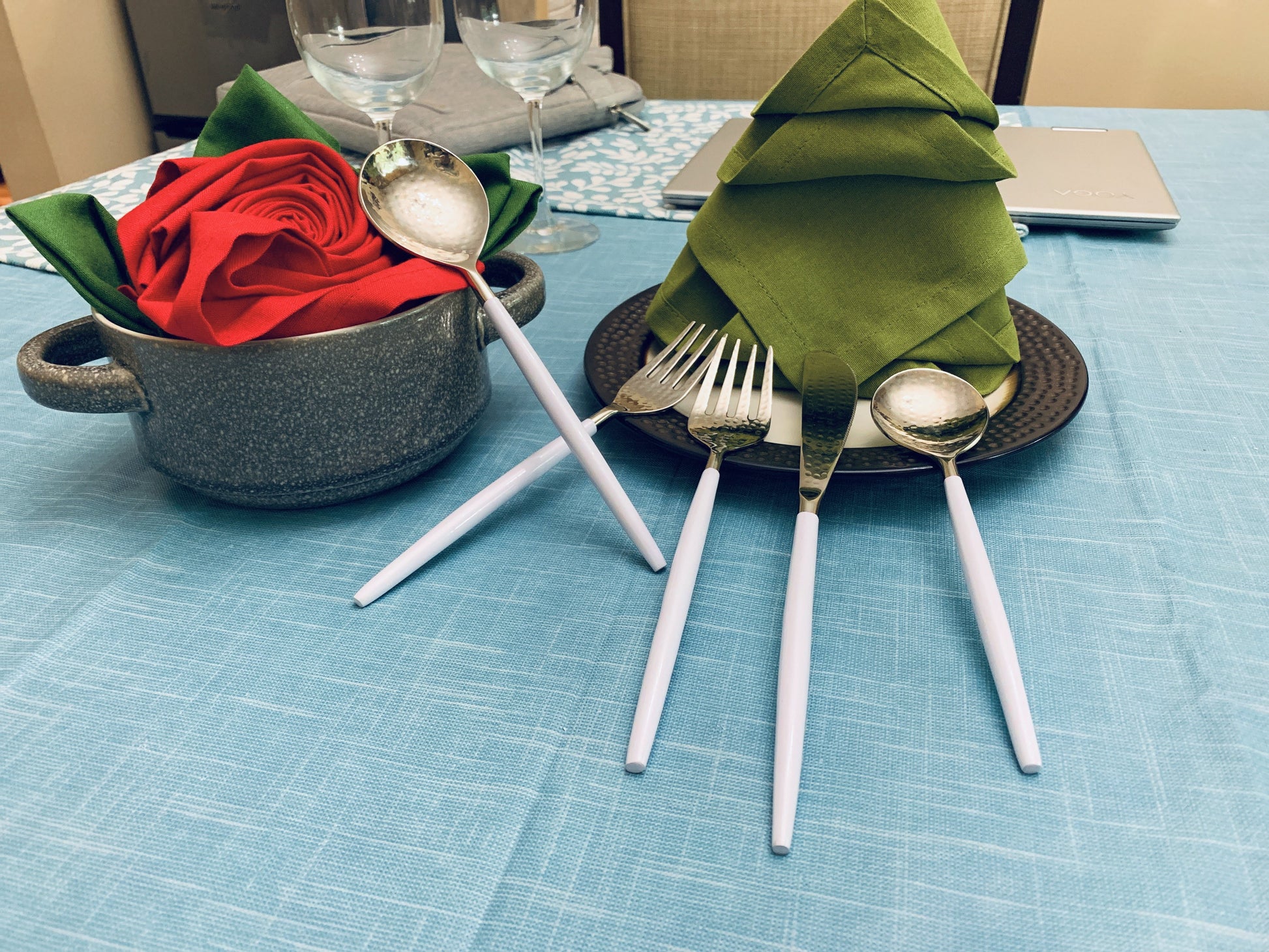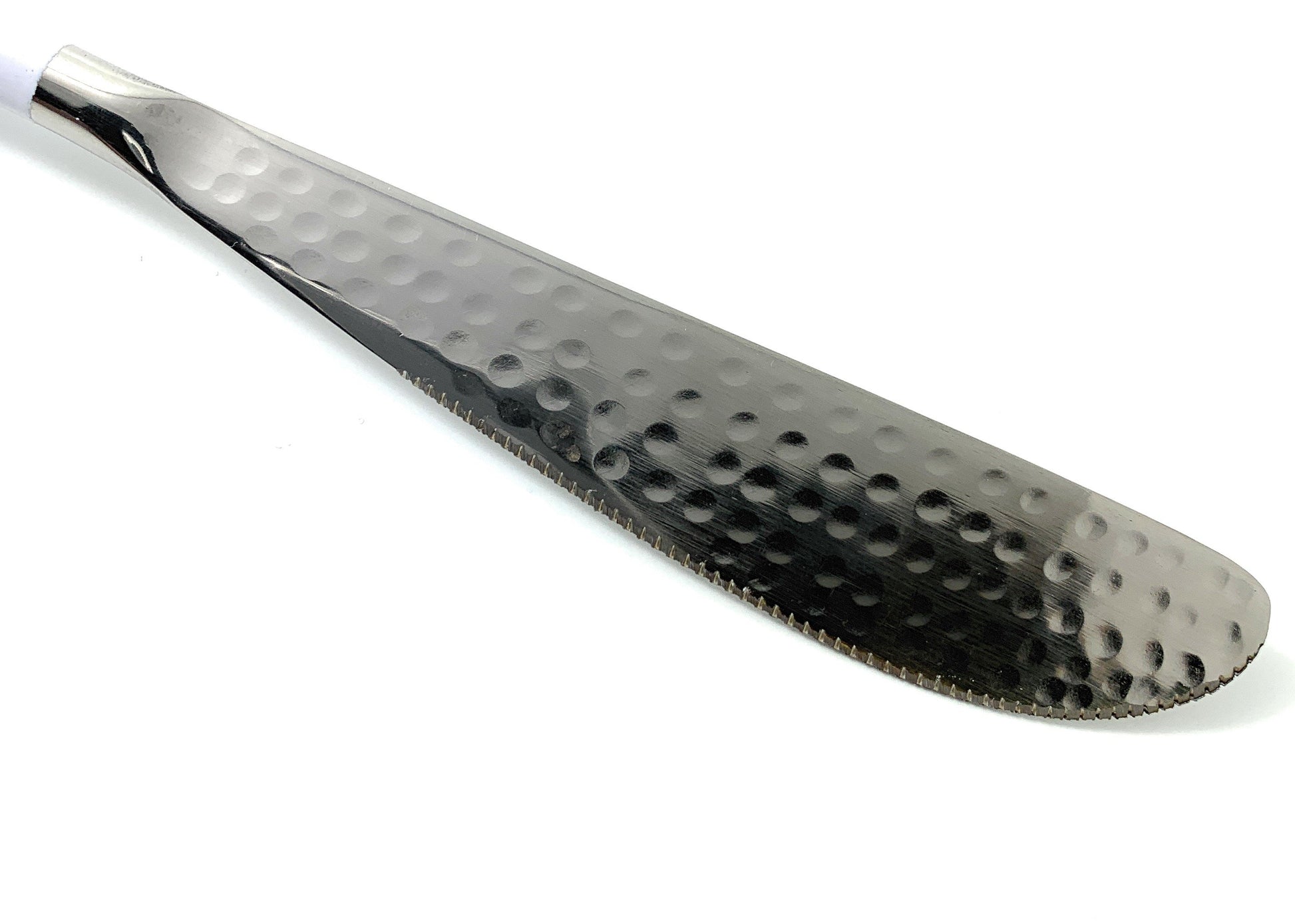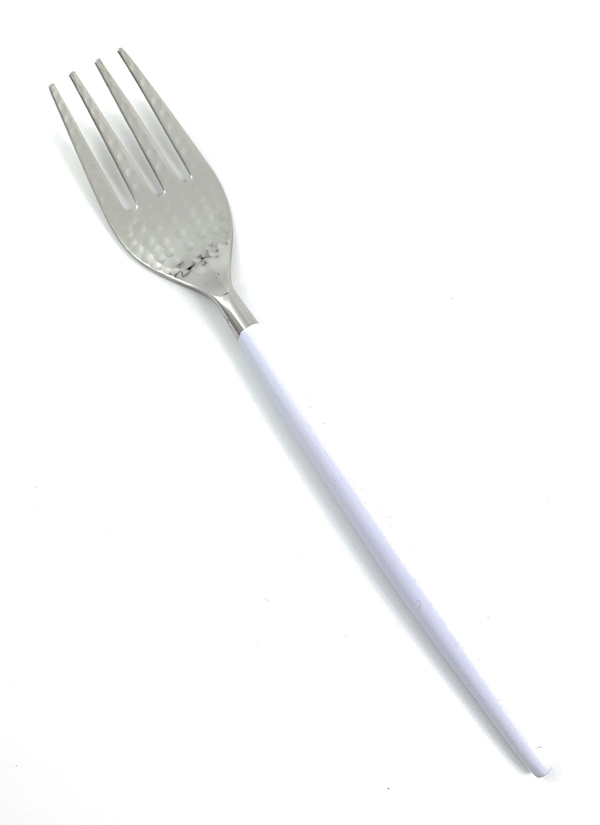 - Made by artisan Stainless Steel cutlery set. White powder coated handle with High Gloss Finish gives a classic look to your parties. Hammered mouth gives a unique look to your table setting