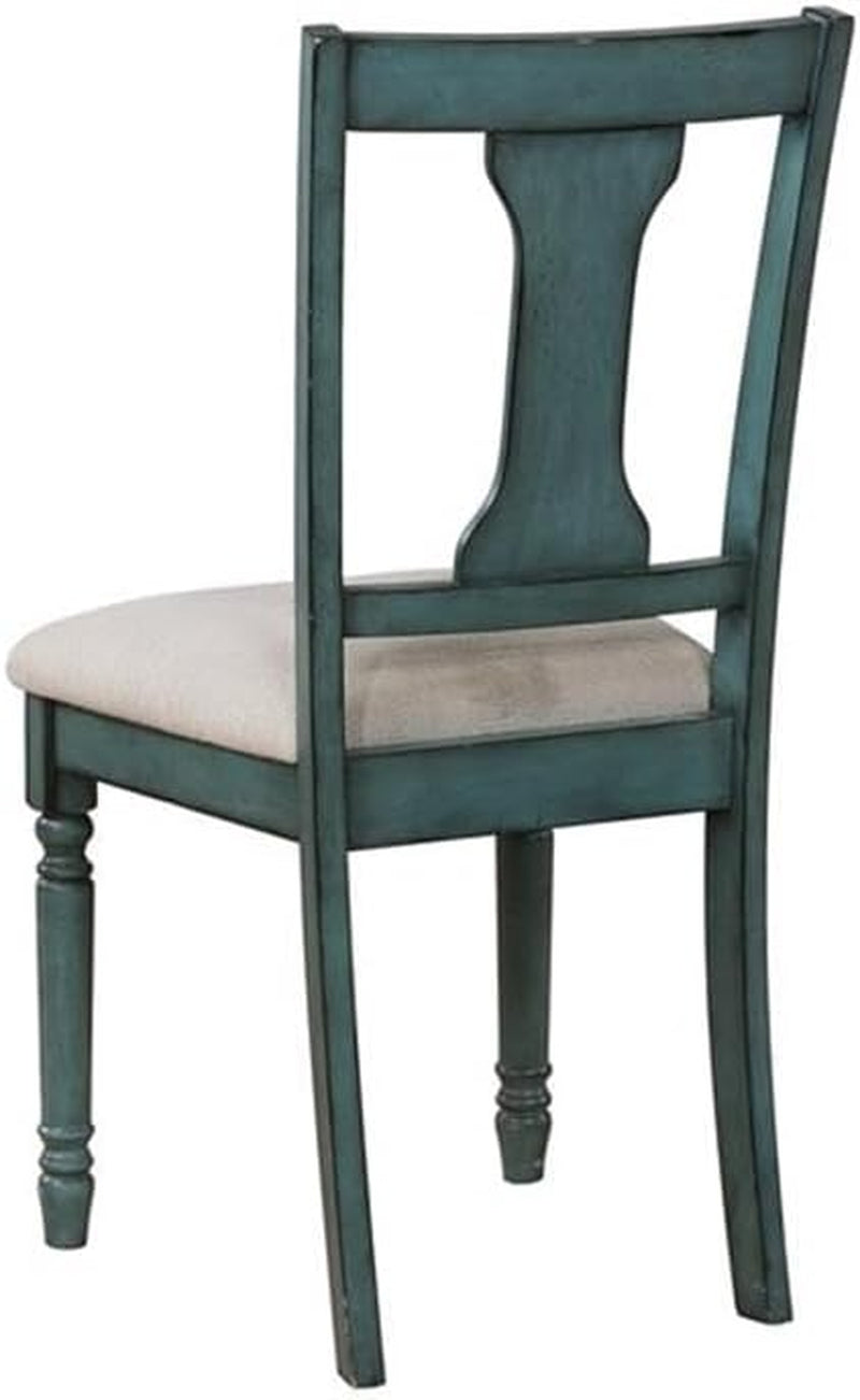 With a beautiful and calming blue finish, this side chair set of two will make a statement in your home. The finish features a teal blue dry brushed glaze finish with wormhole distressing. The attention to detail in the design features of turned legs and chiseled edging make this set stand out. The padded seats are made for comfort and style with a neutral fabric with tonal variation. Matching table and bench are available to complete the set. Some assembly required.