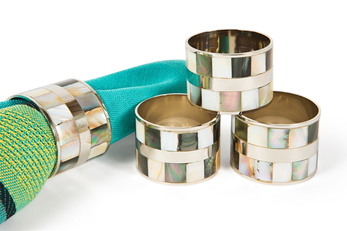 Bring more to the table! Luxurious mother of pearl inlay adorns these durable metal napkin rings, letting you serve elegant beauty with every meal.