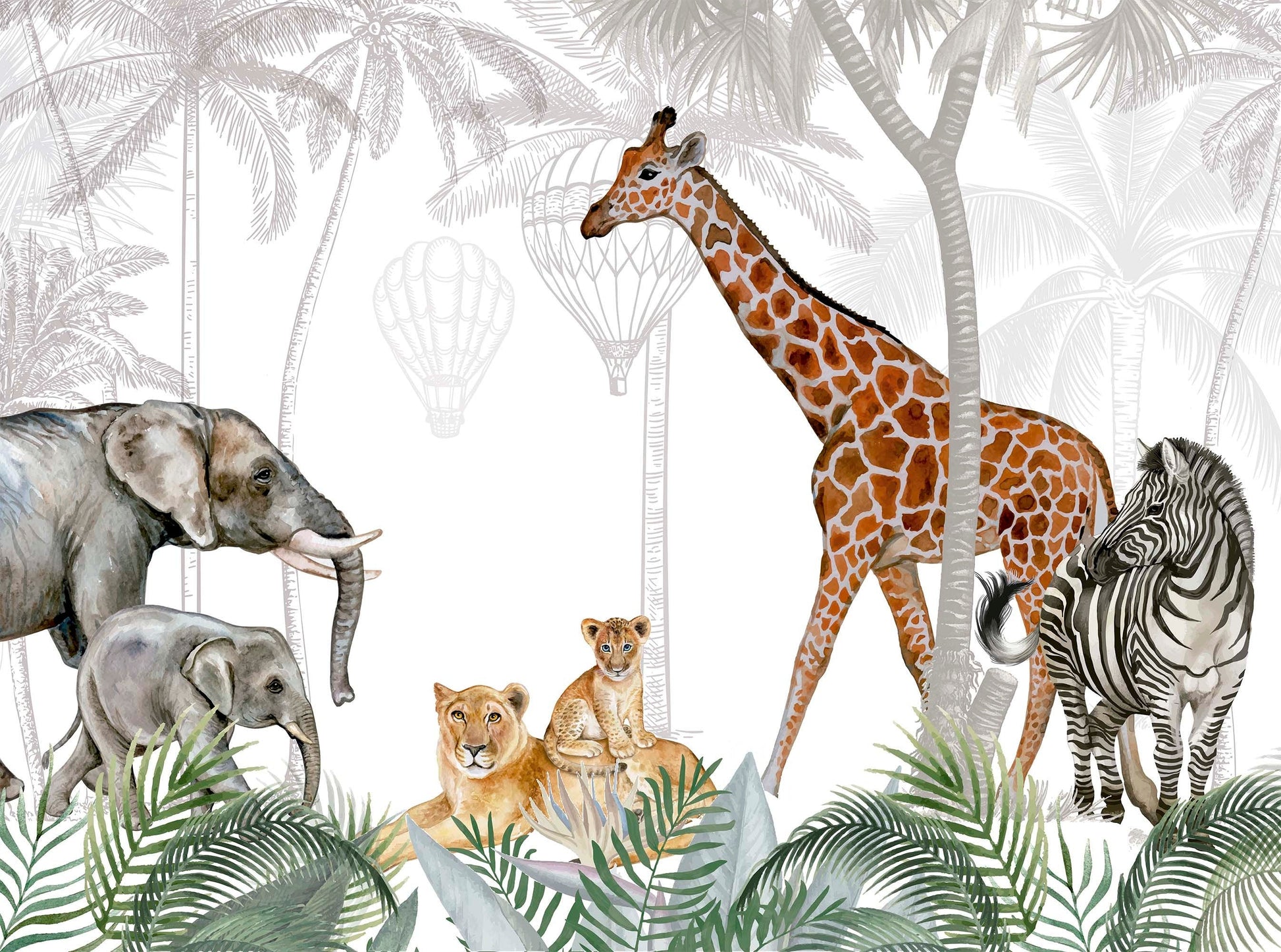 Transform your child's room into an enchanting jungle safari with our Kids Roaming Safari Wallpaper Mural. This captivating mural features majestic elephants, giraffes, and zebra and lush greenery that will spark their imagination and bring vibrant wildlife to their space.