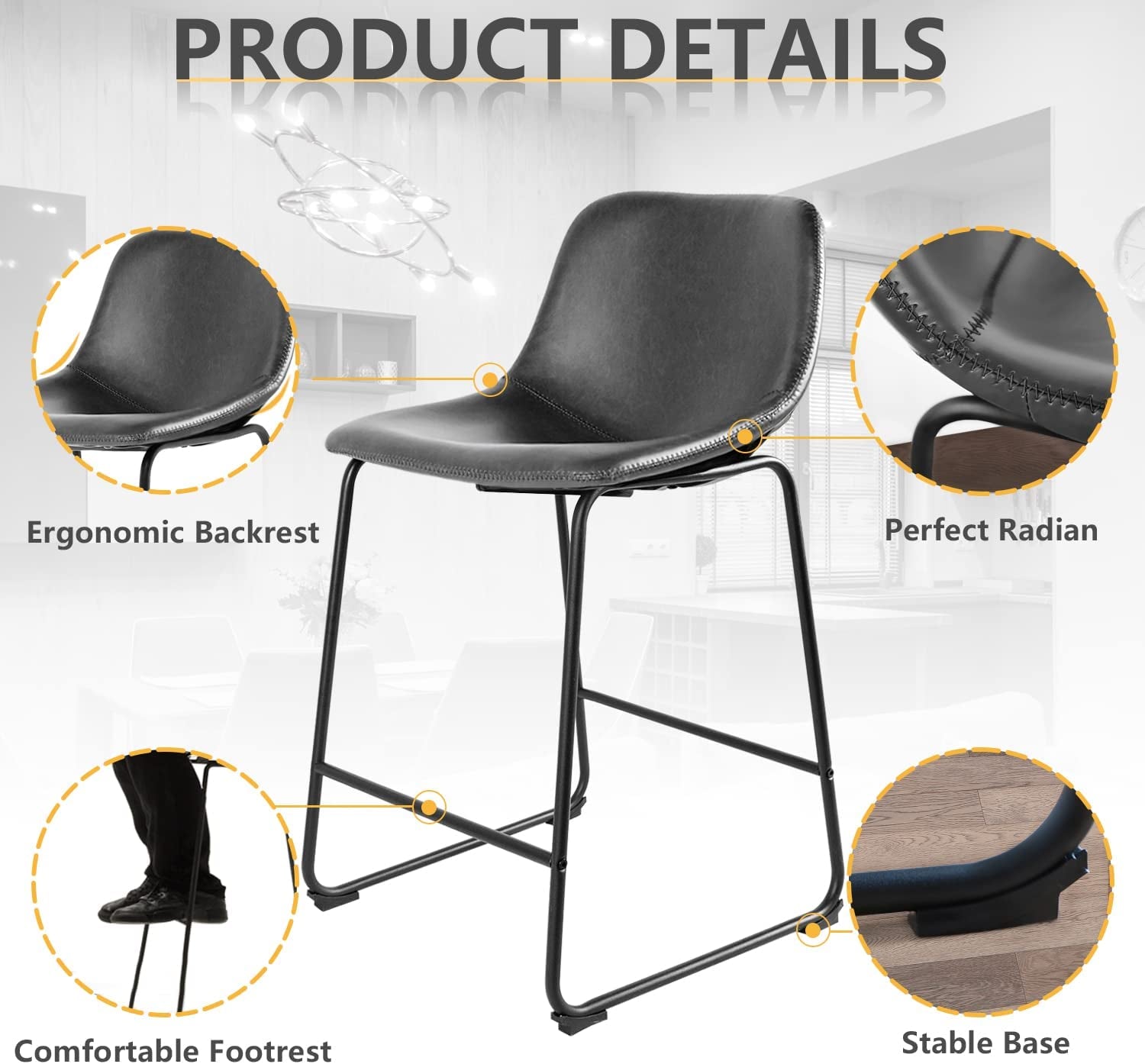 Ergonomic DesignFit your waist curve and give you a sense of comfortable and security! The durable metal frame allows weight capacity up to 300lbs. Bucket seat is made with a foot rest and upholstered in faux leather. | Soft PU Leather & Refined StitchesCovered by high quality PU leather, our counter height stools are more durable to weat and tear. Dirt and water resistance are the advantages of the leather. If the chairs become dirty or wet, you could make it clean within two seconds with a piece of cloth. | Anti-Slip ProtectersThe bottom of counter height chairs are equipped with four anti-slip protecters for protecting floor from scratches. They could also ensure the safety of seating, safer for kids. |
