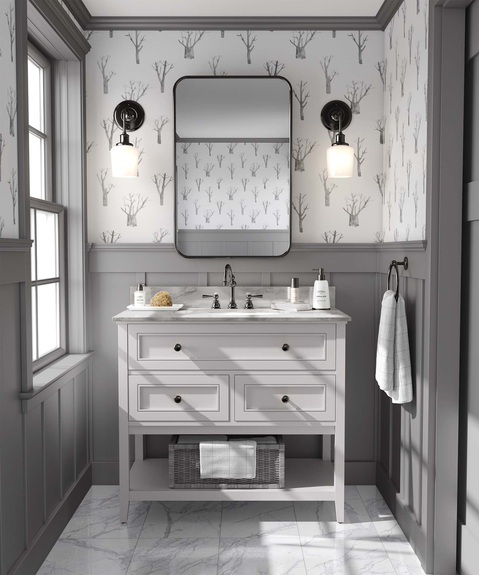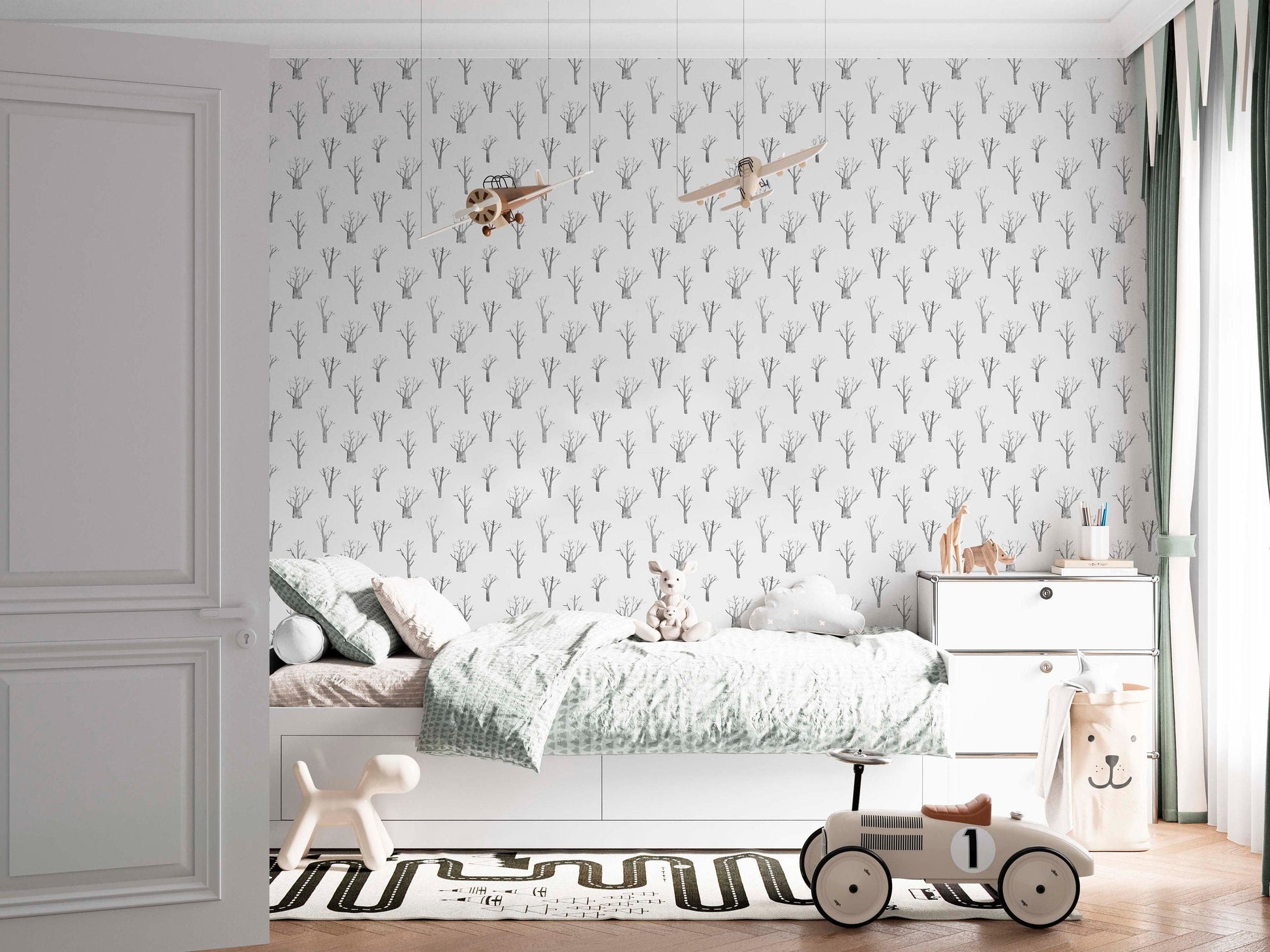 The wallpaper design features elegant winter trees in a soothing palette of white and grey. Each tree stands as a testament to the simplicity and elegance of nature. The custom wallpaper is the perfect choice for those seeking to bring the enchanting allure of a winter forest into their living space. Perfect for nursery bedrooms.