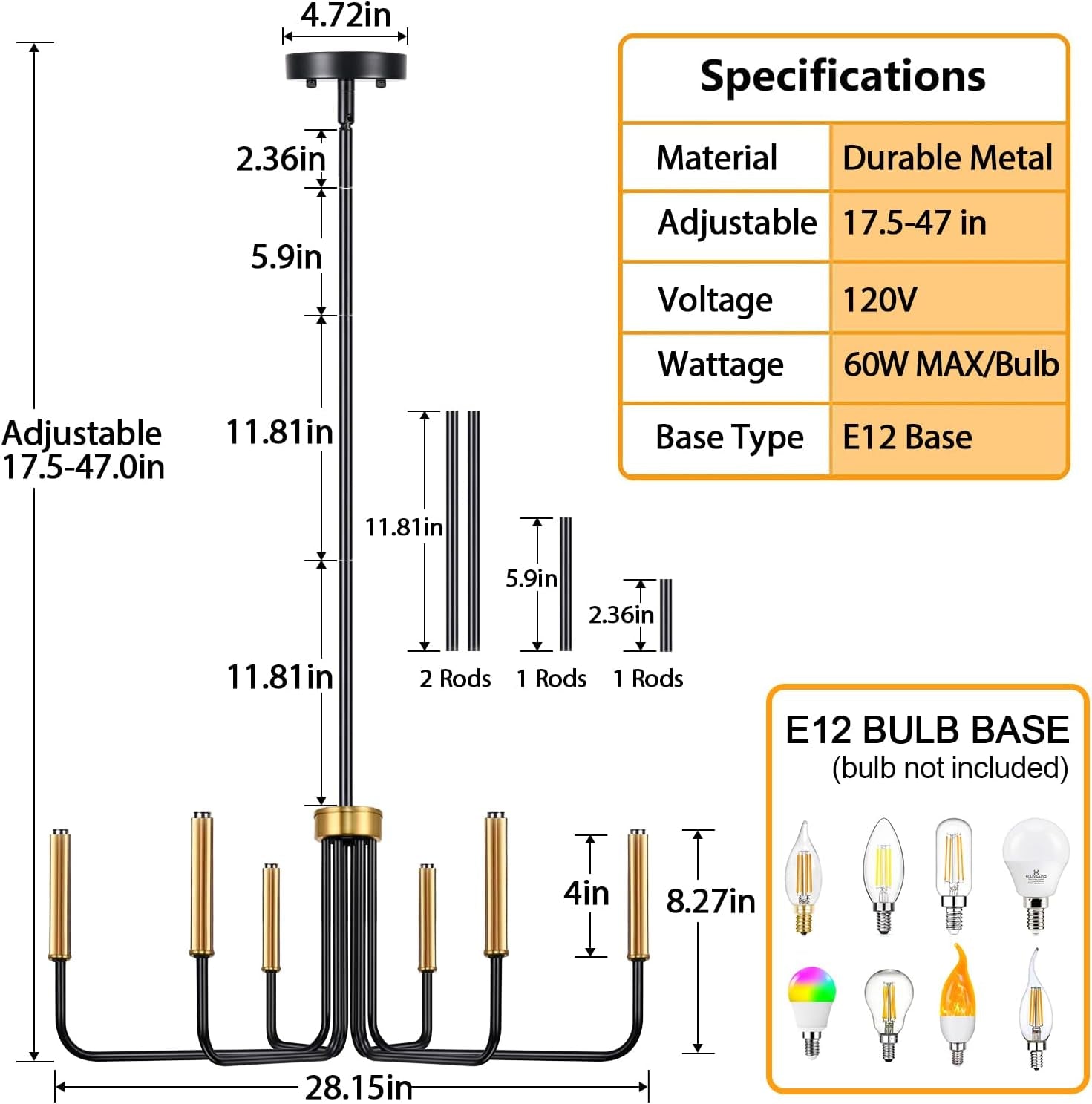 - Adjustable Height: Featuring a stable splicing rod design, the chandelier's height can be adjusted from 17.5 inches to 47 inches, accommodating both sloped and flat ceilings for versatile placement.