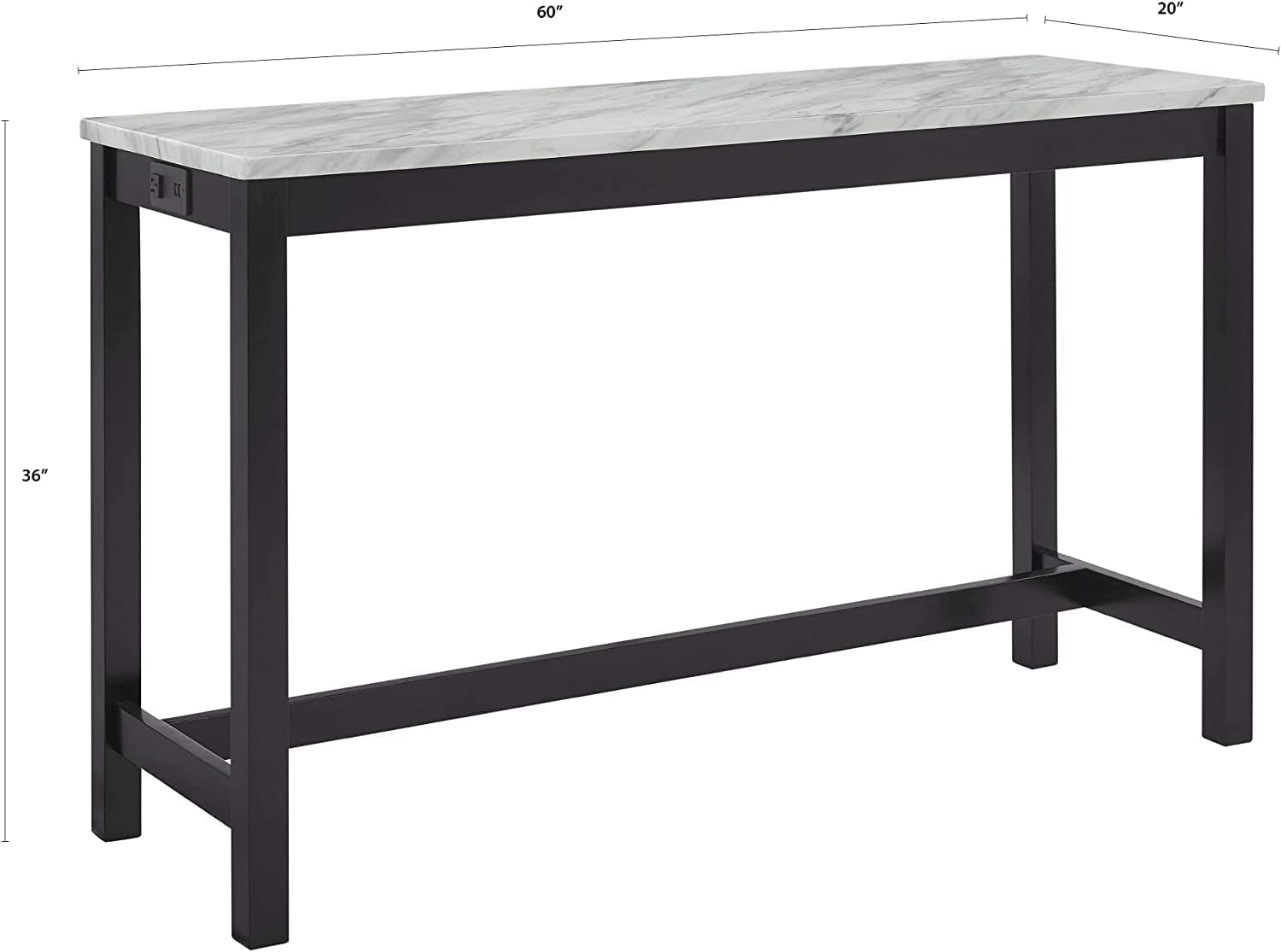 New Classic Furniture presents the Celeste Theater Bar Table Set, an elegant solution for extra seating and task space. Place the bar table behind a sofa for theater style seating, or in the kitchen or dining room for a breakfast table or dining set. Three plush, button tufted velvet barstools accented with silver nailhead trim stow discreetly under the table for space saving convenience. The Bar Table features a footrest and a heat and water resistant faux marble top with elegant white and gray pattern. Turn it into a desk or workspace by using the built-in USB Charging ports and Electrical outlets to connect your devices. Available with Royal Blue, Gray or Black Stools.