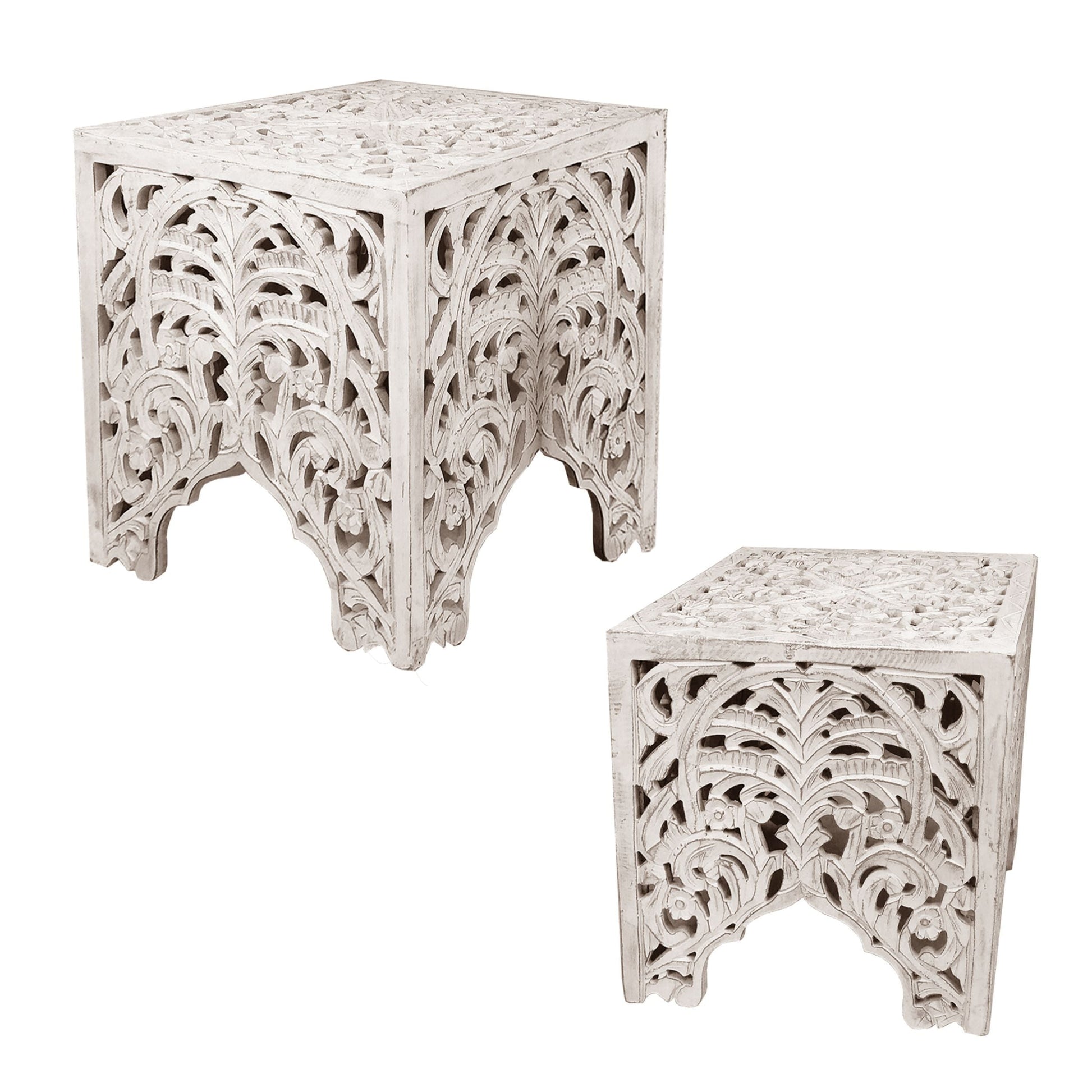 Wooden End Table with Floral Cut Out Design, Set of 2, Antique White