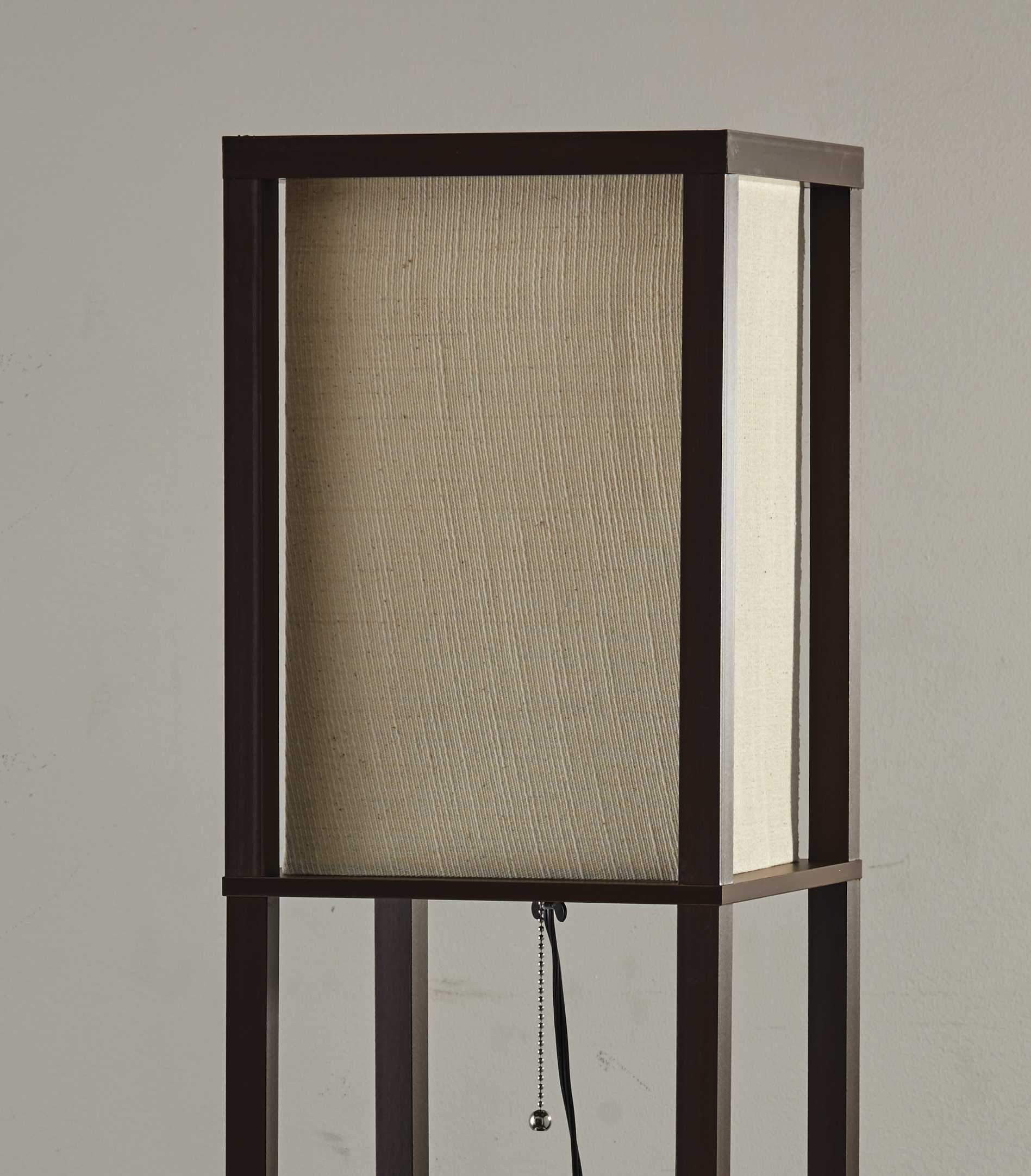Have it all with style and multi-function. This shelf floor lamp features a walnut wood finished open box frame with two additional display or storage shelves, making it a handy addition to the living room, den, office, or bedroom. The square natural textured shade diffuses light from a 150 Watt incandescent or equivalent bulb. The lamp has on-off functionality with a metal ball accented pull chain switch. This lamp has a clear cord and is smart outlet compatible. The lamp comes with clear wire clips for a clean look. Bulb is not included.