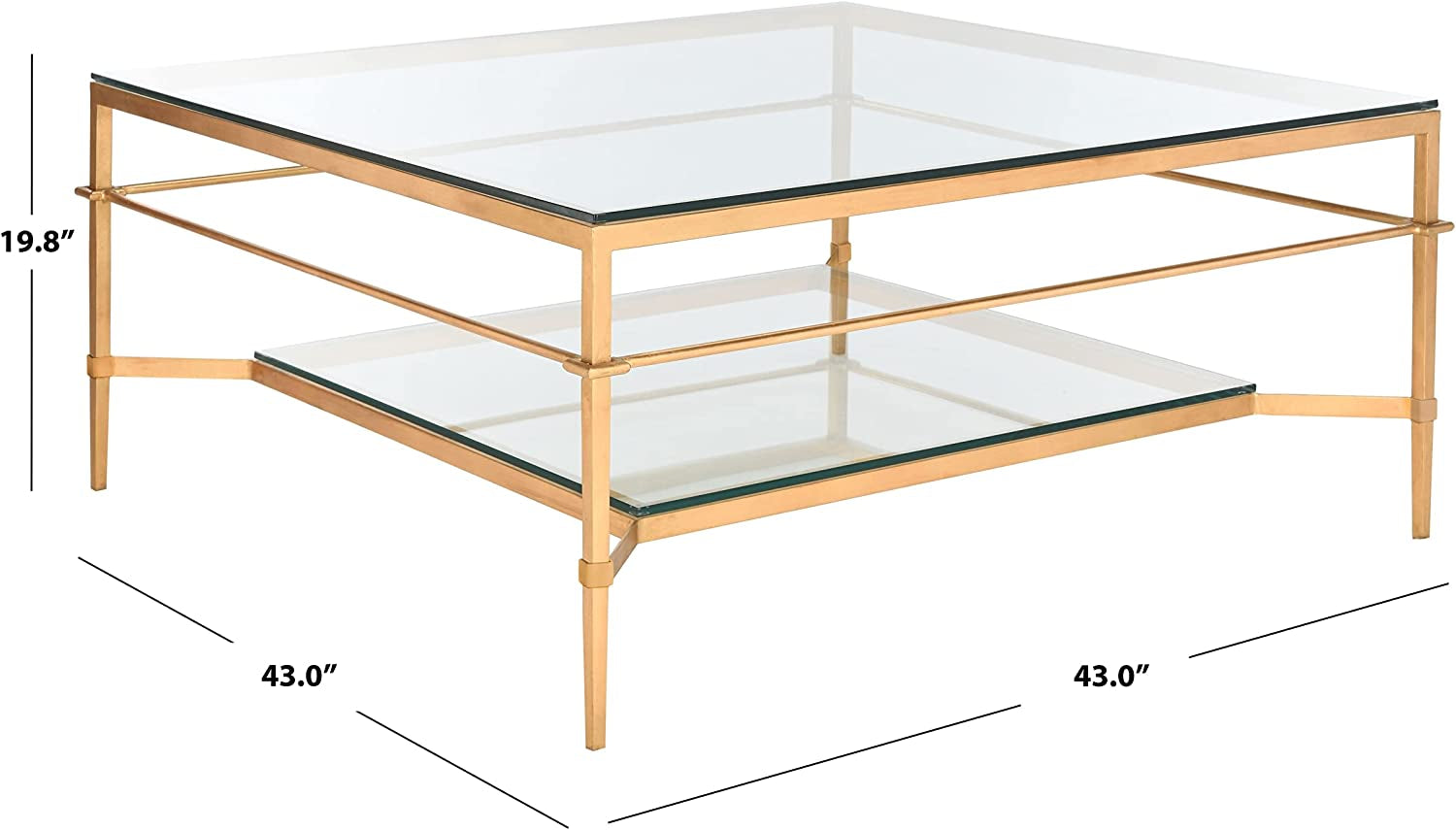 The luxurious Mieka gold leaf cocktail table is designed for elegant entertaining in transitional living rooms. Its see-through glass shelves give it the appearance of sculpture, while providing a practical, easy care surface for drinks and canapés.