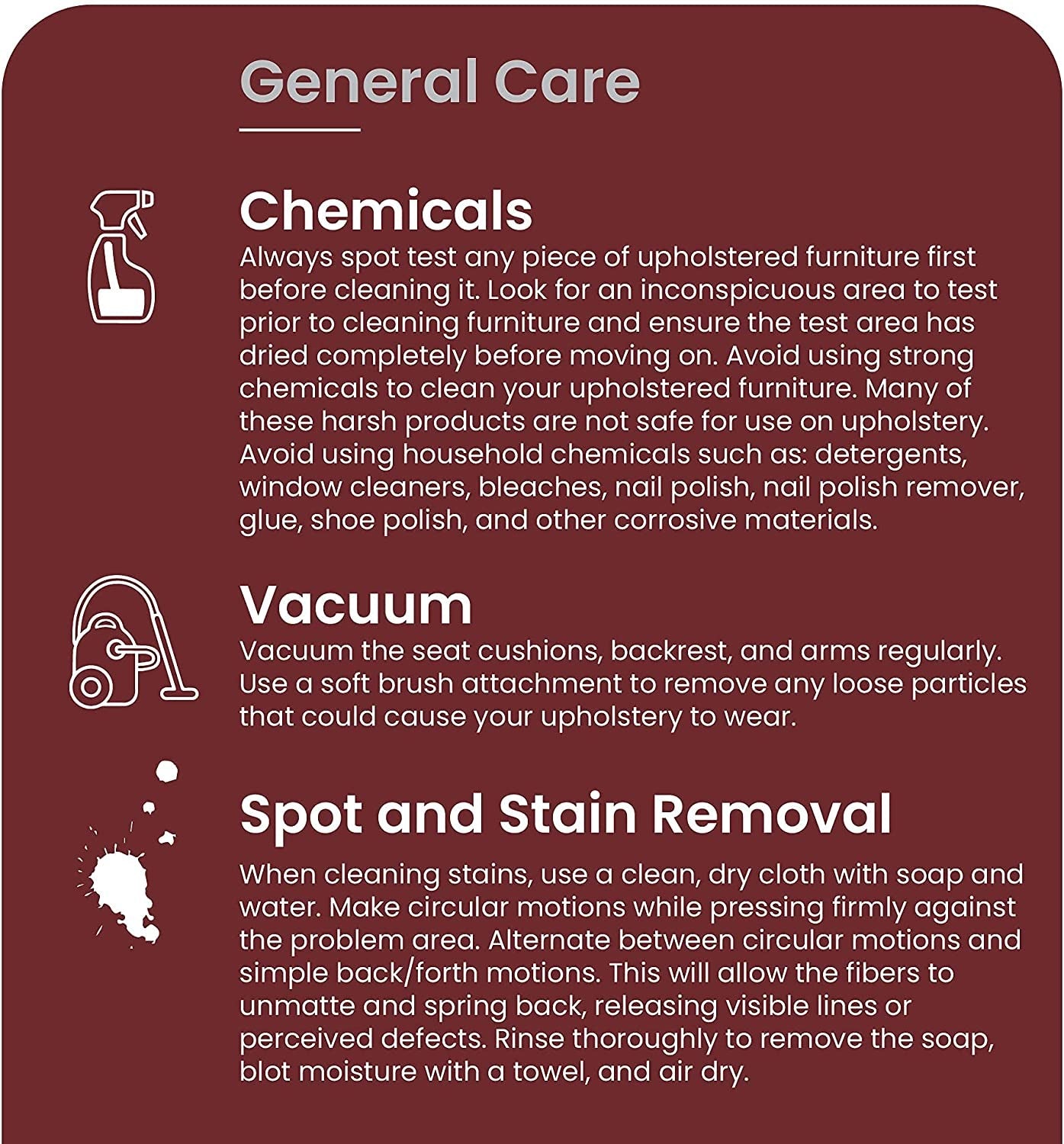 - CARE INSTRUCTIONS: Vacuum occasionally, and use the soft brush attachment to remove particles. Spot clean prior to a full clean. Use a dry cloth with soap and water, and apply pressure using circular motions; avoid harsh chemicals to treat.
