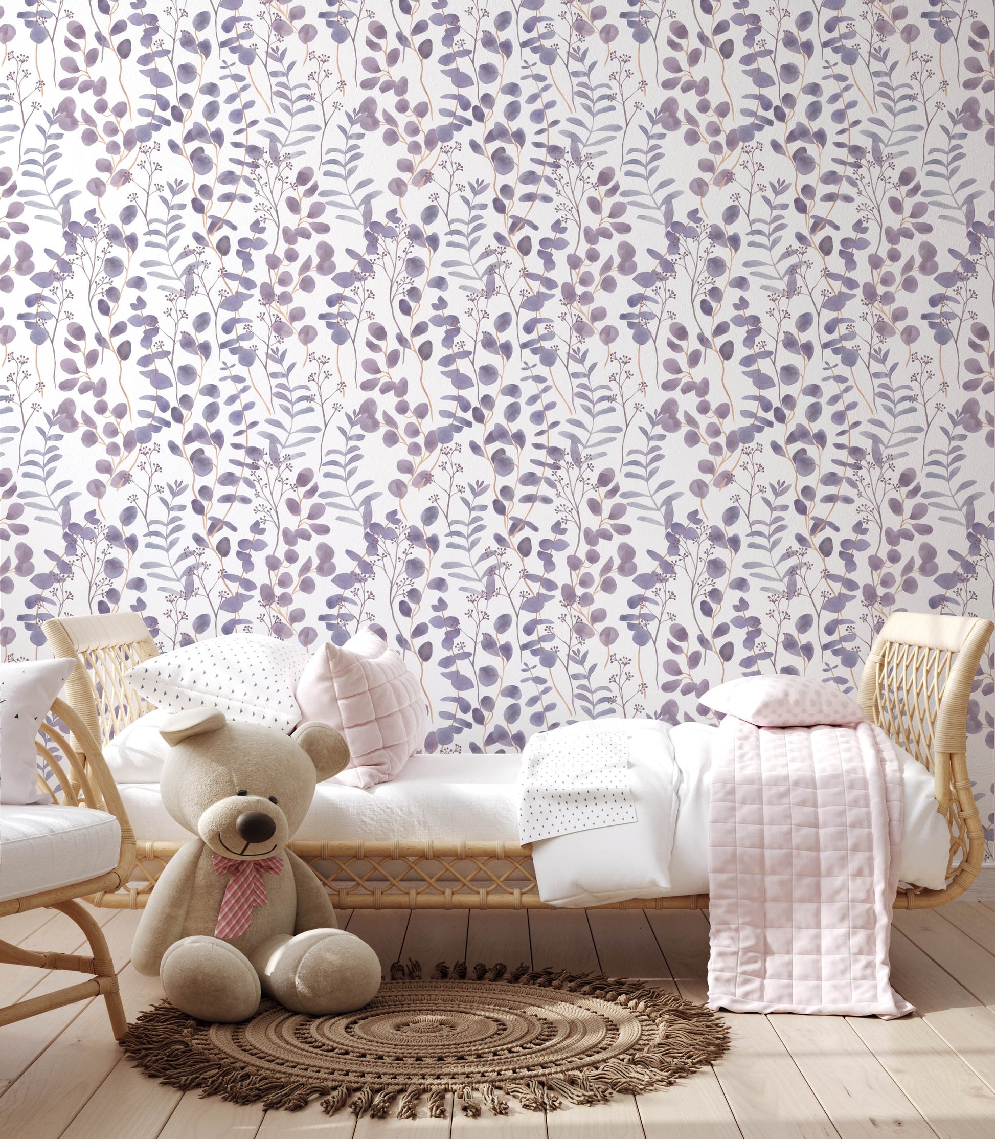 Cozy, cheerful, and slightly romantic with a design inspired by the spring beauty of eucalyptus leaves. This is the Lilac Leaves Wallpaper, in a beautiful lilac tone ideal for decorating bathrooms or nursery rooms.