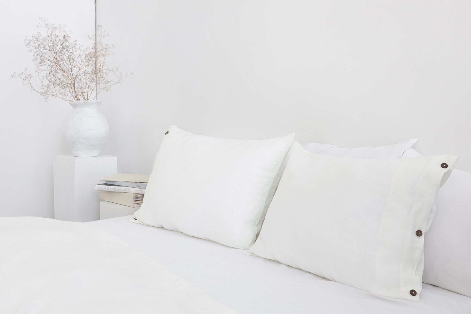 White linen bedding set with coconut buttons