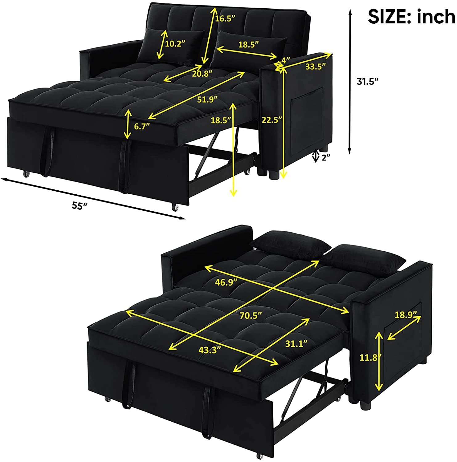 - ★ 【EASY TO ASSEMBLE】 Sofa Size: 55.2" W*33.5" D*31.5" H, Sleep Sofa Size: 70" D*44.3" W*18.5" H. Comes with an instruction manual, follow the instructions to assemble the parts, you just need to make up the 4 legs and the removable armrests on both sides.