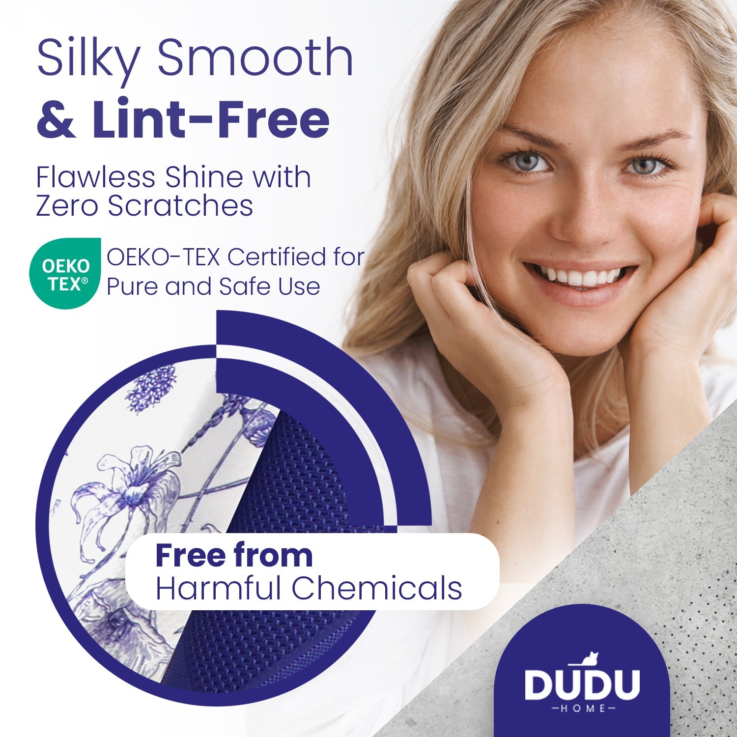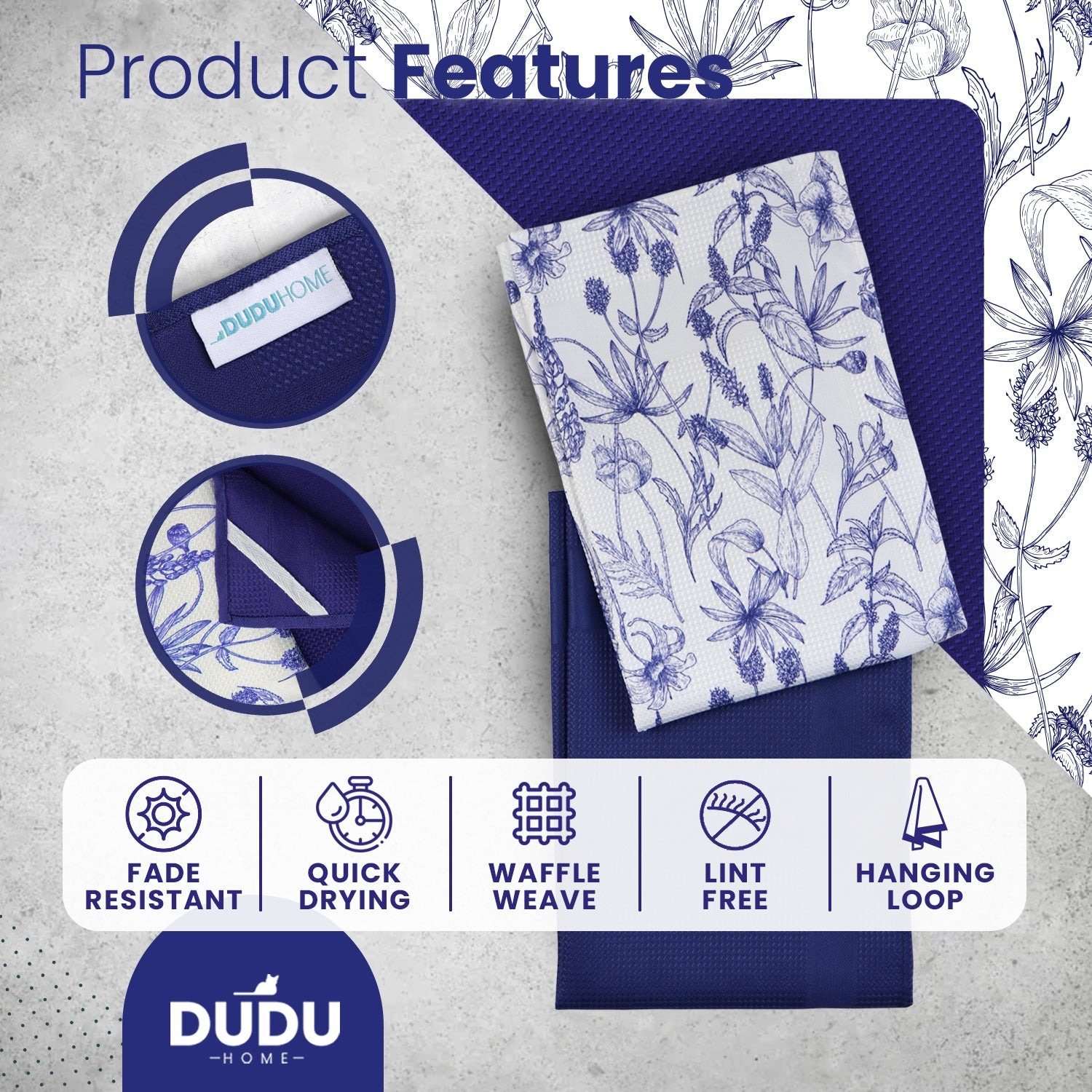 High-quality floral kitchen towels that keep their vibrant turquoise or navy blue color and integrity wash after wash — no shrinking, shredding, or losing their unique waffle weave texture. -