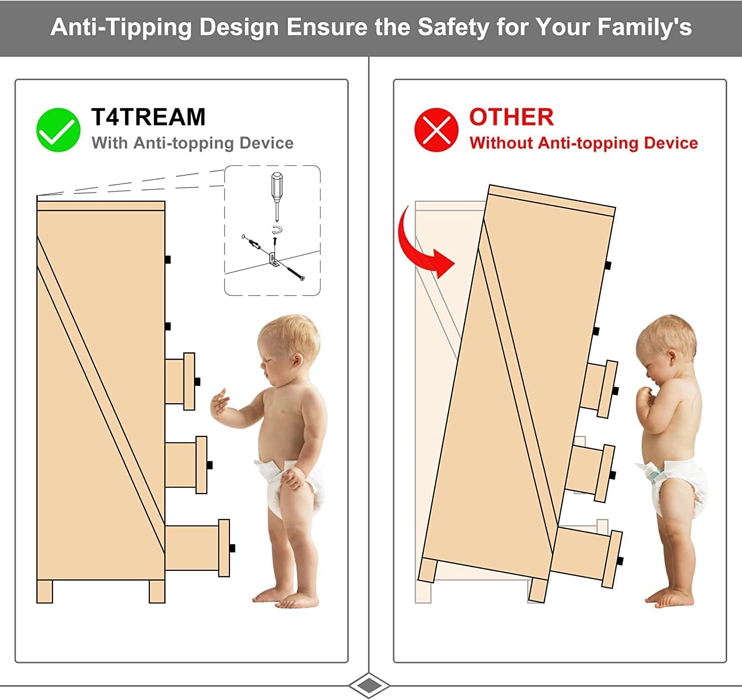 - 【Sturdy & Durable】The bedroom dresser is made of durable engineered wood for long term use, scratch resistant. No strong odor.The widened 2’’*2’’ dresser legs made the dresser does not slide easily, provide great durability and stability. With a support leg in the middle for added weight support.