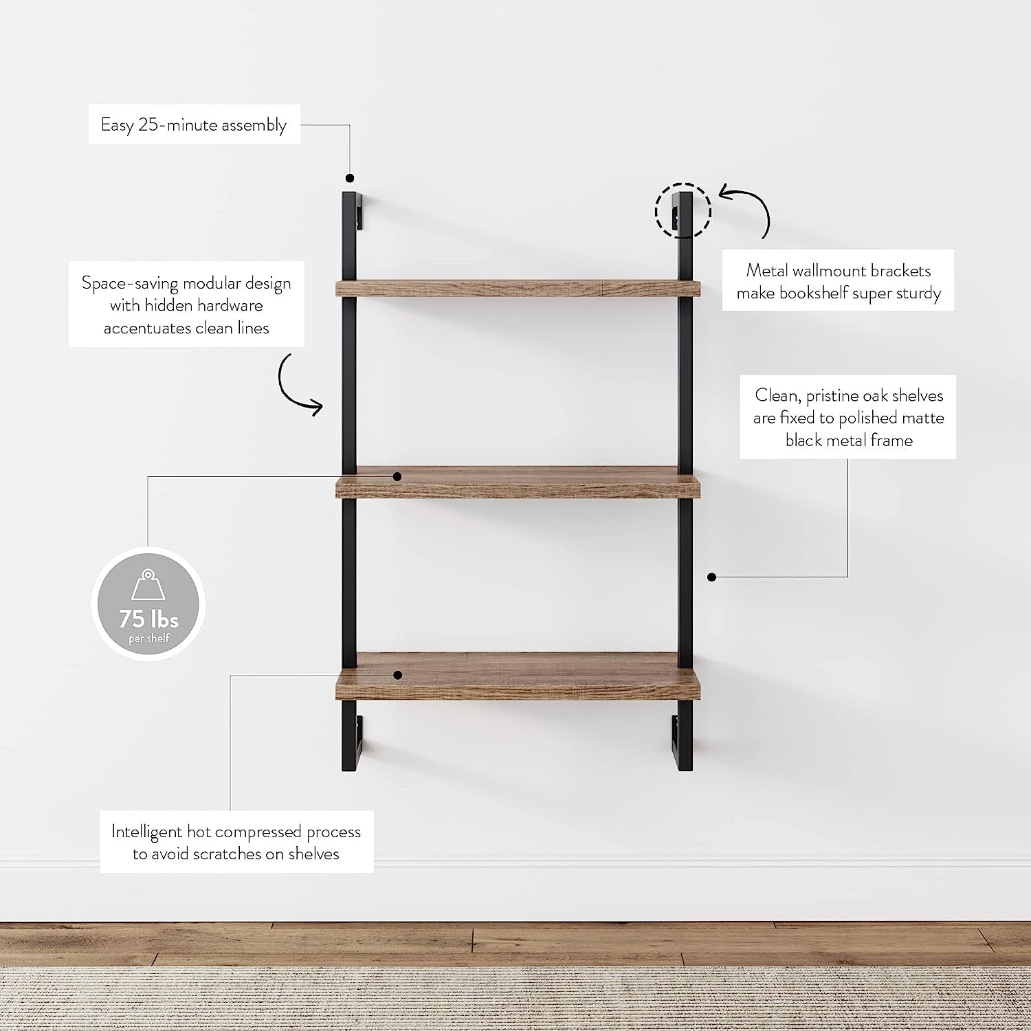 Theo wall mount bookshelf is a space-saving bookcase with an industrial and minimalist style featuring 3 wooden shelves and a metal pipe frame. This small compact hanging shelving unit is an easy way to display your collectibles and features a keyhole wall mount for easy hanging. Its floating design helps save space and gives off a clean, modern vibe. Pair it with other Theo Bookcases for extra storage. Nathan James is the furniture company built for this generation. You don't need to spend a fortune to get quality design-first furniture and when we say easy assembly, we mean it. Our guarantee is our word. Your purchase is backed by a 100% money-back guarantee. If you have any quality issues just contact us and we will send you a replacement immediately—no questions asked. This product is not recommended for commercial use. Materials: -Rustic Oak laminate -Matte black metal Assembly Must-Haves: -Drill -1/4 drill bit -Phillips-head screwdriver Weight Limit: -55 lbs. per shelf