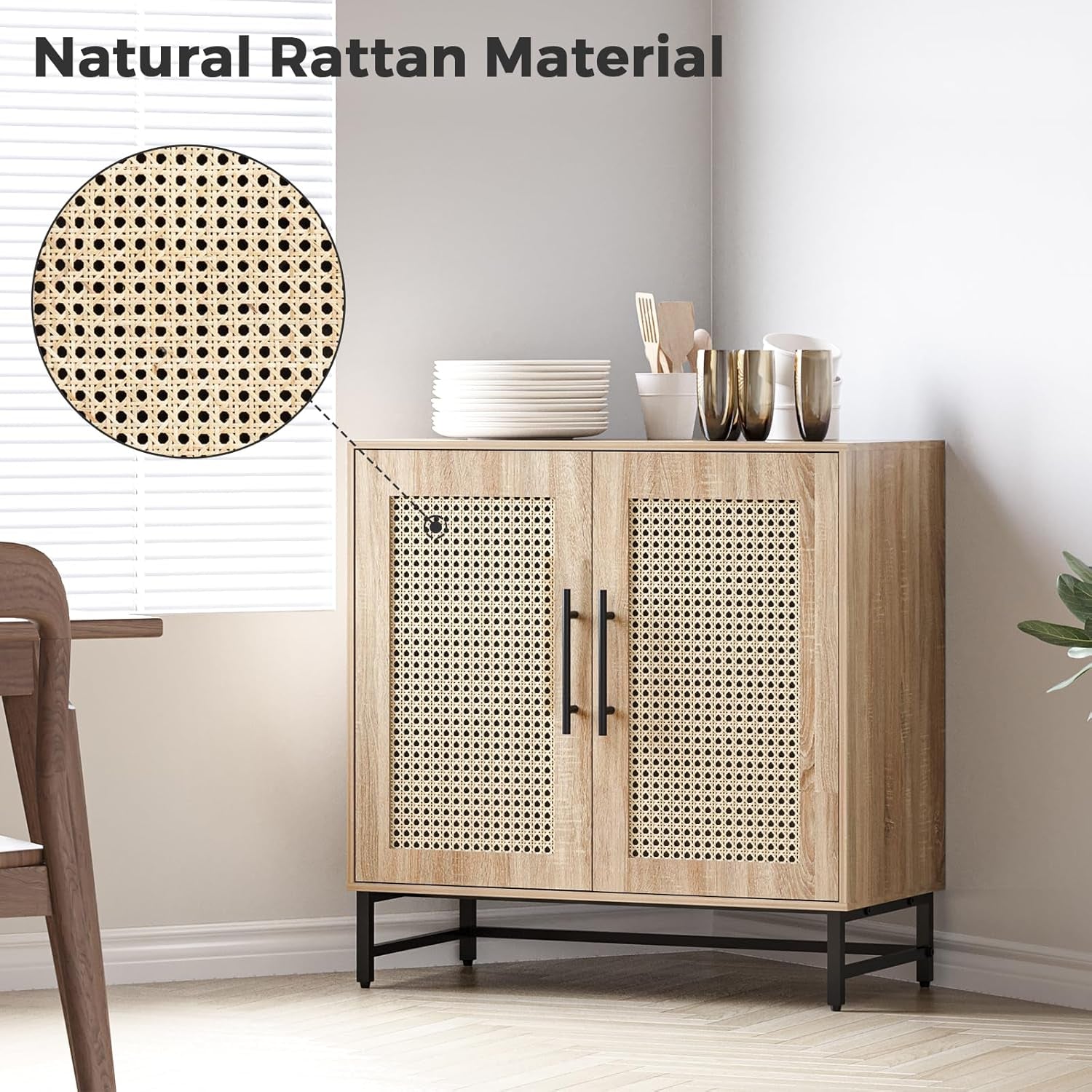Storage Cabinet with Handmade Natural Rattan Doors, Rattan Buffet
