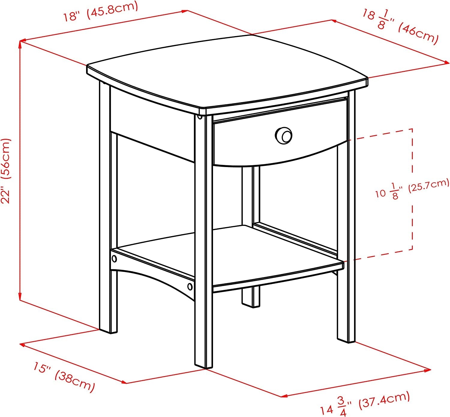 Combining solid beechwood construction with a tidy and practical style, this versatile end table/night stand makes a fresh and clean addition to the room. The oversized tabletop features a straight-edged square shape, while below the four rectangular legs host a deep storage drawer and open shelf. For subtle flair, the drawer front and lower side rails are sculpted with a wide curve that softens the table's overall look. Also notice how the wood nailhead accents and a simple drawer pull offer a tailored finish. Classic enough to stay in style no matter how the furnishings around it change, this table comes in four handsome finishes: Natural, Walnut, Black, and White. It measures 18 inches in diameter by 22 inches high. --Kara Karll