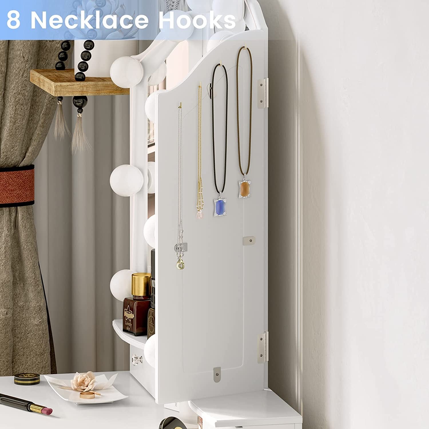 - TRI-FOLD MIRROR: The side mirrors fold 180 degree so you can always find the right angle to perfect your look. And when you fold them up, there shows your favorate necklaces and jewelry on the hooks. Extra bonus! Plus, removable mirror makes it both a vanity and a workstation