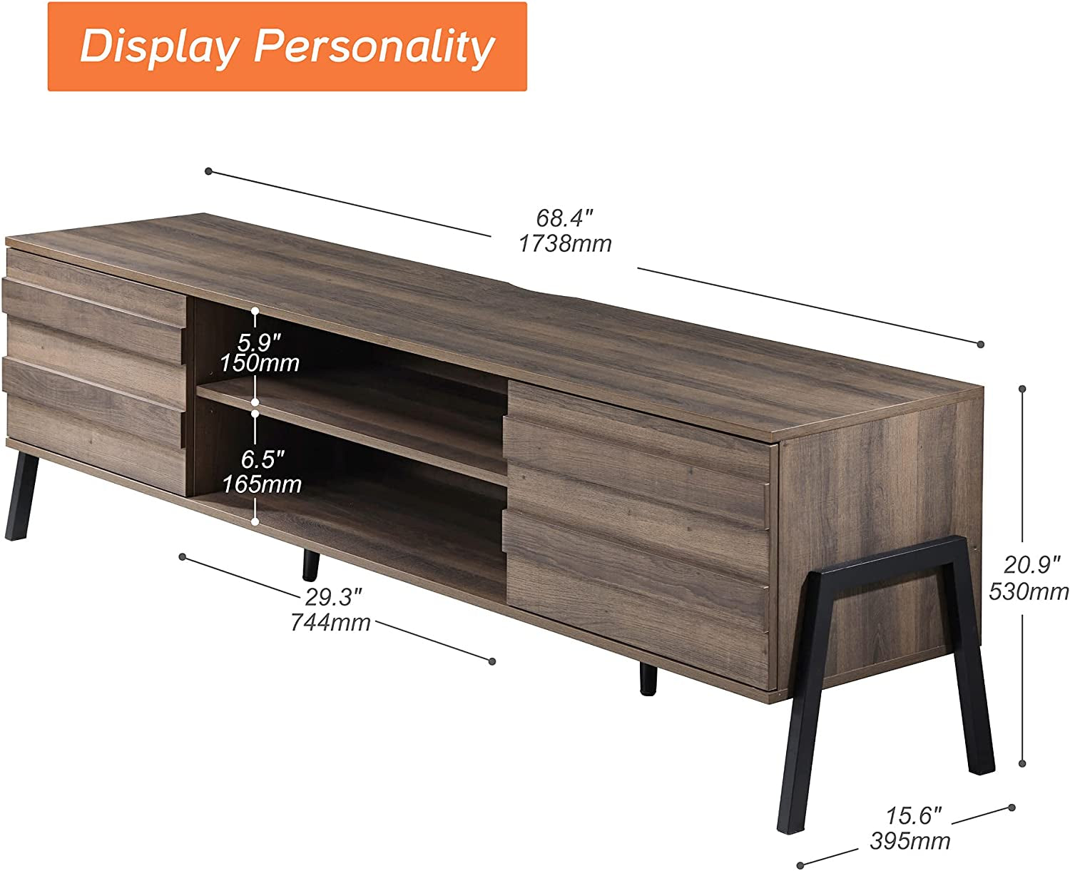 - 【Mid-Century Modern entertaiment center】The Television Stand is designed with dimensions of 68.4" L x 15.6” W x 20.9" H. Suitable For TVs up to 80 inch. Made from high grade certified MDF that promises a long service life. The overall finish is quite smooth and waterproof without any smell no harm and easier to clean, Weight limit of top board is 275 lbs.