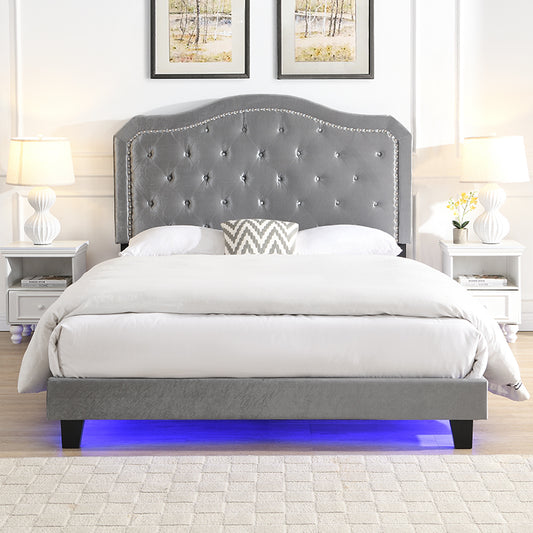 Upholstered Bed Button Tufted with Curve Design - Strong Wood Slat Support - Easy Assembly - Light Grey Velvet - With LED light-platform bed - Queen