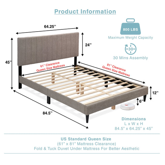 Gray Upholstered Queen Platform Bed Frame, Tufted Channel Headboard, Mid-Century Bedroom Furniture, No Box Spring Required, Bed Frame Wood Slats, Modern Soft Boucle, 64.25' x 84.5' x 45'