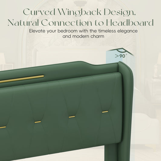 King Size Leather Upholstered Bed Frame, Modern Bed Frame with Wingback Head board, Upholstered Platform Bed with Wavy Footboard, No Spring Box Needed, Dark Green