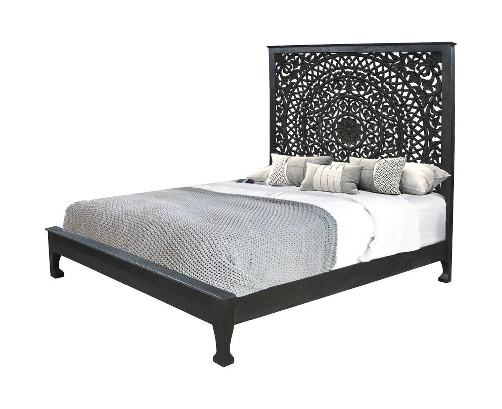 Add a luxuriously appointed bed that will help you create an oasis of comfort and relaxation in your home with this black carved floral distressed solid wood king bed frame. Built to last, this piece not only looks good but reflects premium workmanship from top to bottom. This bed will help to create a peaceful environment that will provide restful slumber for years to come. We spend so much time in our bedrooms, thus making quality craftsmanship and good looks vitally important. 74.00-inch h x 88.00-inch w x 81.50-inch d.